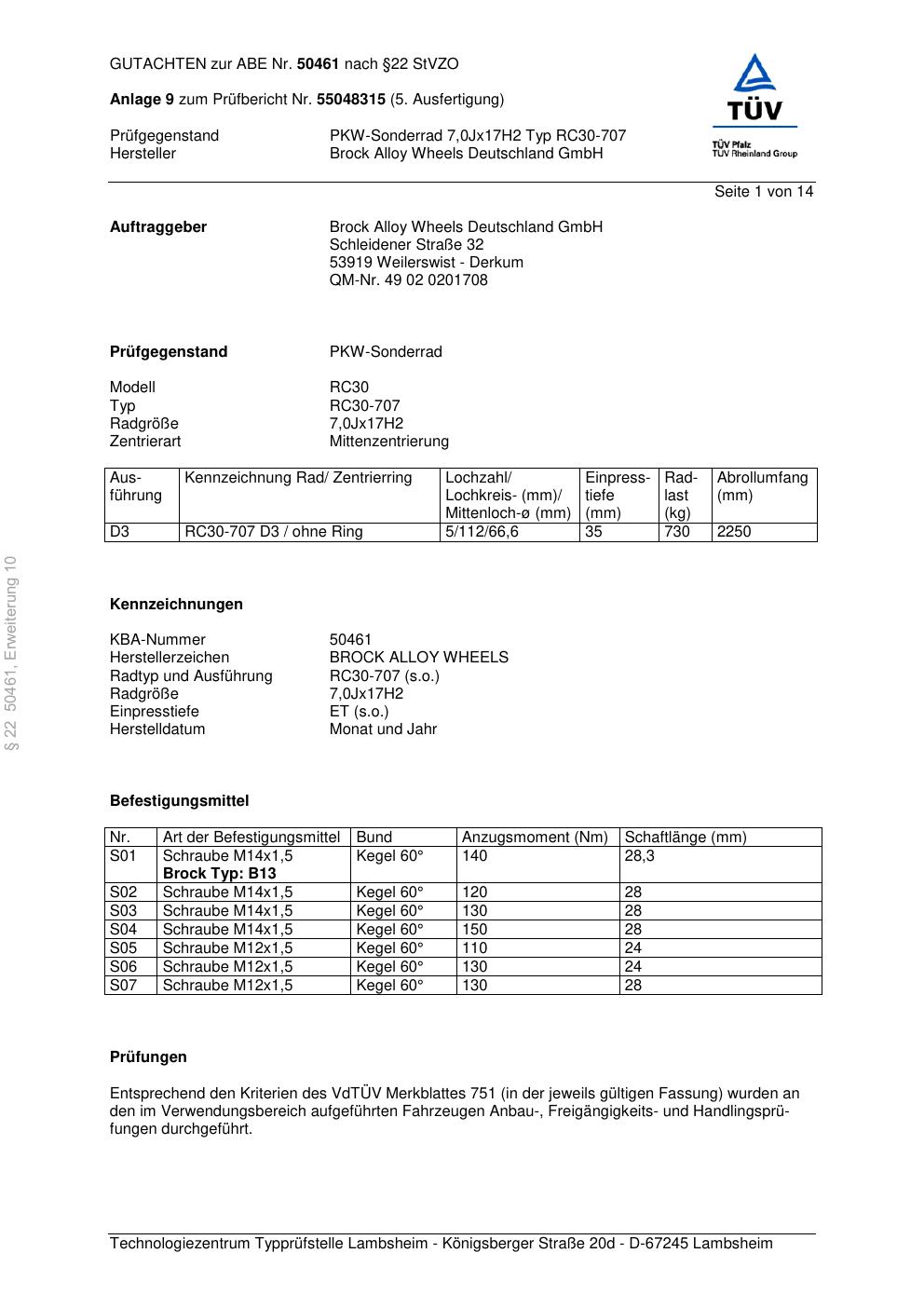 Dieses Gutachten (abe) bezieht sich auf die Alufelge Brock RC30-707 in der Ausführung 7Jx17 ET 0, Mittenloch 0 mm (KBA 50461). Im PDF findest du typischerweise zulässige Reifengrößen, Auflagen/Anbauhinweise und – je nach Dokument – Hinweise zur Eintragung.