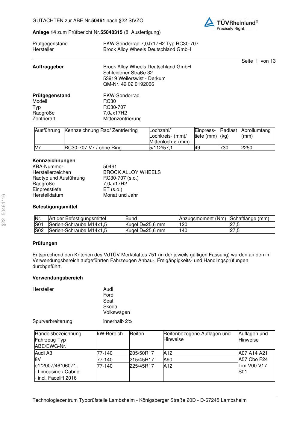 Dieses Gutachten (abe) bezieht sich auf die Alufelge Brock RC30-707 in der Ausführung 7Jx17 ET 0, Mittenloch 0 mm (KBA 50461). Im PDF findest du typischerweise zulässige Reifengrößen, Auflagen/Anbauhinweise und – je nach Dokument – Hinweise zur Eintragung.