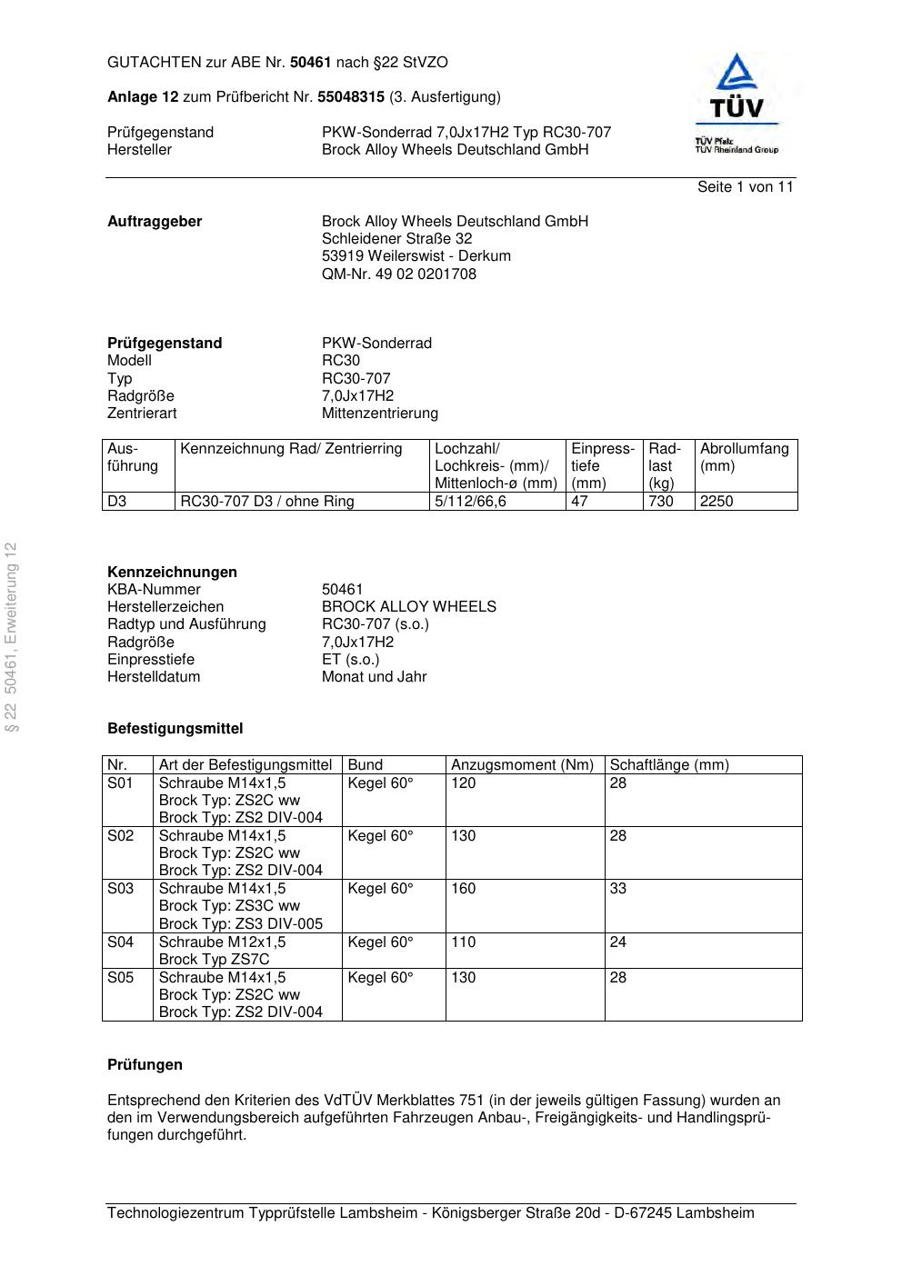 Dieses Gutachten (abe) bezieht sich auf die Alufelge Brock RC30-707 in der Ausführung 7Jx17 ET 0, Mittenloch 0 mm (KBA 50461). Im PDF findest du typischerweise zulässige Reifengrößen, Auflagen/Anbauhinweise und – je nach Dokument – Hinweise zur Eintragung.
