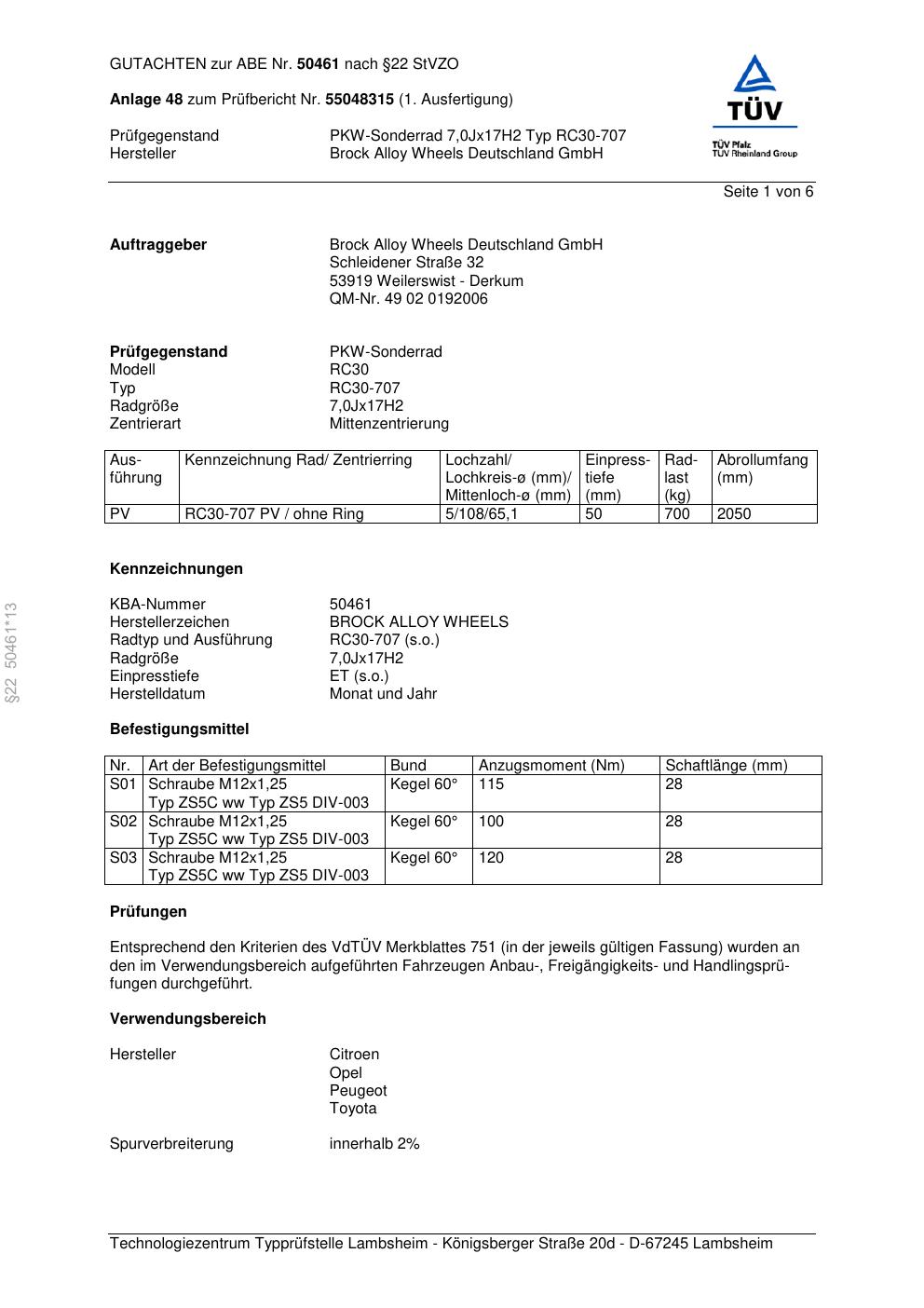 Dieses Gutachten (abe) bezieht sich auf die Alufelge Brock RC30-707 in der Ausführung 7Jx17 ET 0, Mittenloch 0 mm (KBA 50461). Im PDF findest du typischerweise zulässige Reifengrößen, Auflagen/Anbauhinweise und – je nach Dokument – Hinweise zur Eintragung.
