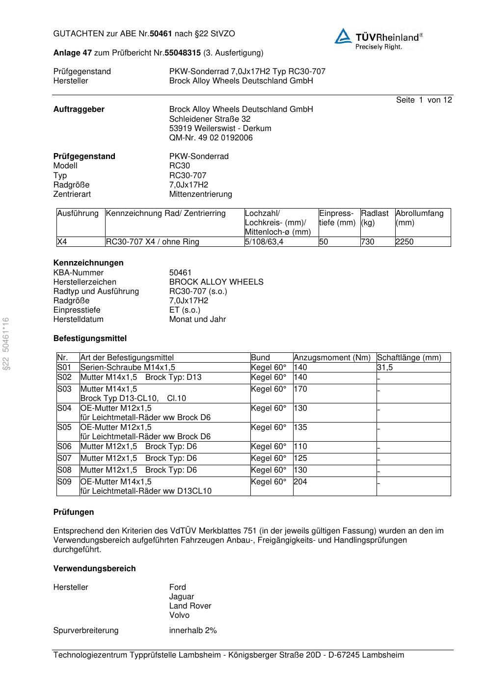 Dieses Gutachten (abe) bezieht sich auf die Alufelge Brock RC30-707 in der Ausführung 7Jx17 ET 0, Mittenloch 0 mm (KBA 50461). Im PDF findest du typischerweise zulässige Reifengrößen, Auflagen/Anbauhinweise und – je nach Dokument – Hinweise zur Eintragung.