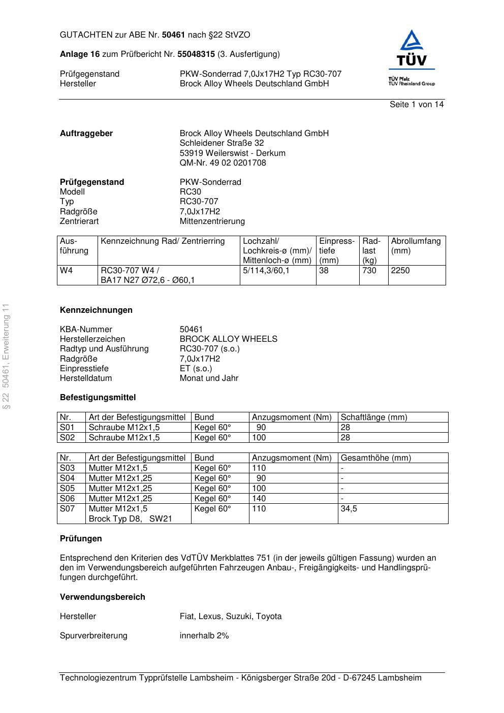 Dieses Gutachten (abe) bezieht sich auf die Alufelge Brock RC30-707 in der Ausführung 7Jx17 ET 0, Mittenloch 0 mm (KBA 50461). Im PDF findest du typischerweise zulässige Reifengrößen, Auflagen/Anbauhinweise und – je nach Dokument – Hinweise zur Eintragung.