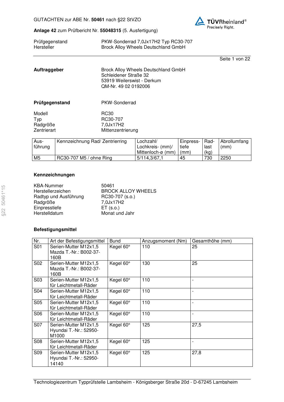 Dieses Gutachten (abe) bezieht sich auf die Alufelge Brock RC30-707 in der Ausführung 7Jx17 ET 0, Mittenloch 0 mm (KBA 50461). Im PDF findest du typischerweise zulässige Reifengrößen, Auflagen/Anbauhinweise und – je nach Dokument – Hinweise zur Eintragung.