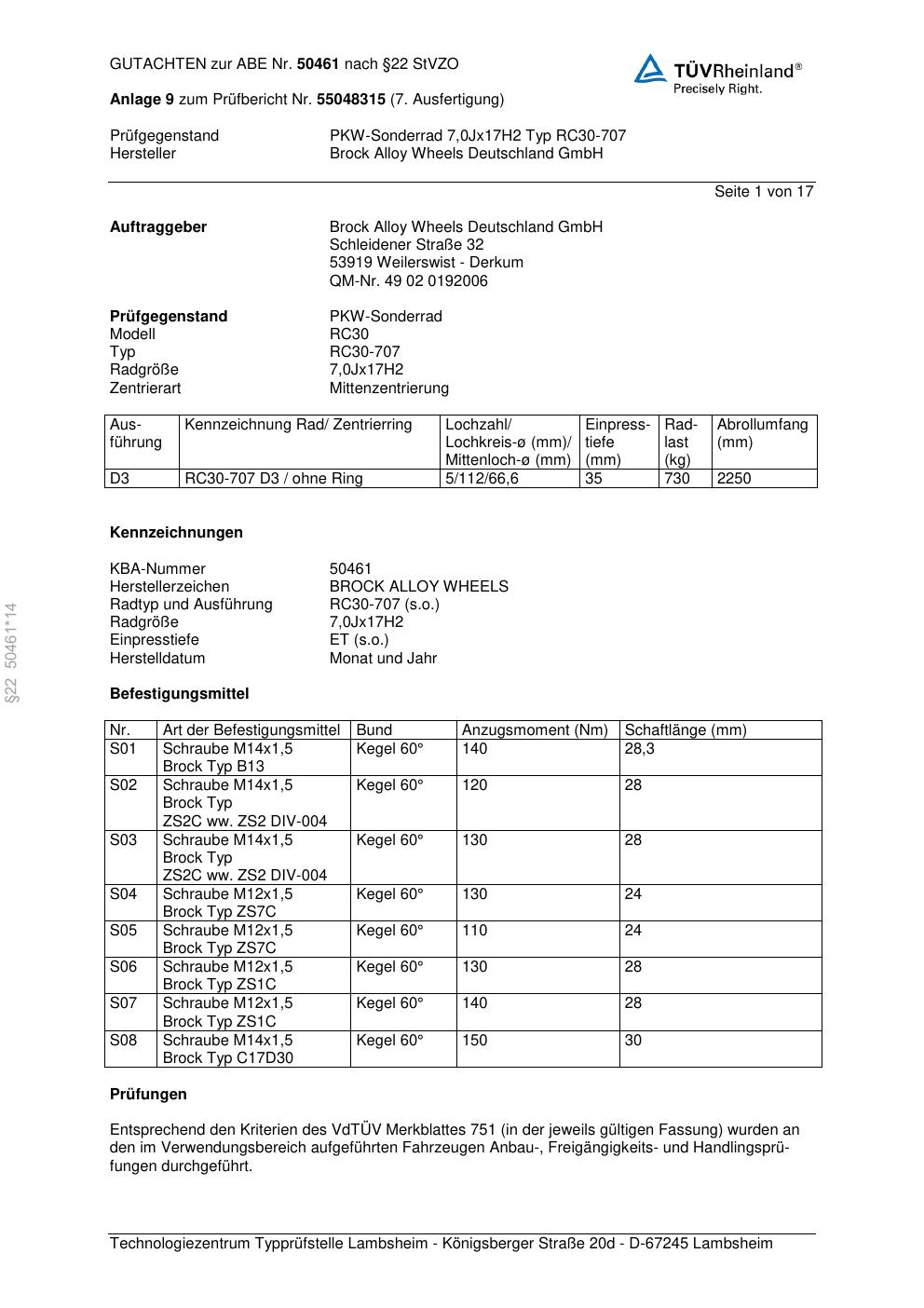 Dieses Gutachten (abe) bezieht sich auf die Alufelge Brock RC30-707 in der Ausführung 7Jx17 ET 0, Mittenloch 0 mm (KBA 50461). Im PDF findest du typischerweise zulässige Reifengrößen, Auflagen/Anbauhinweise und – je nach Dokument – Hinweise zur Eintragung.