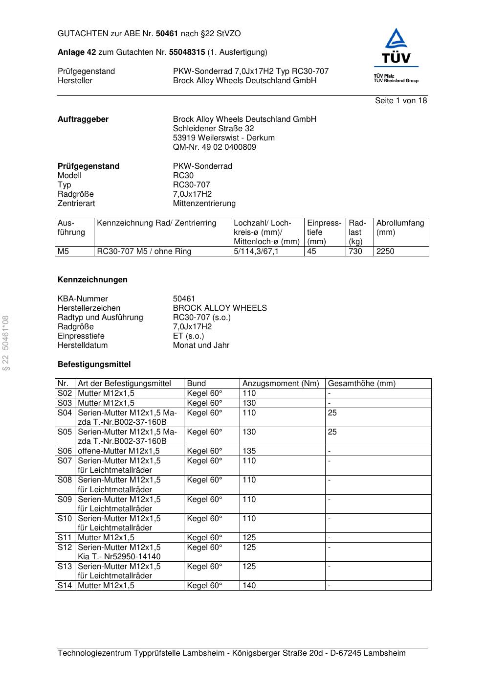 Dieses Gutachten (abe) bezieht sich auf die Alufelge Brock RC30-707 in der Ausführung 7Jx17 ET 0, Mittenloch 0 mm (KBA 50461). Im PDF findest du typischerweise zulässige Reifengrößen, Auflagen/Anbauhinweise und – je nach Dokument – Hinweise zur Eintragung.
