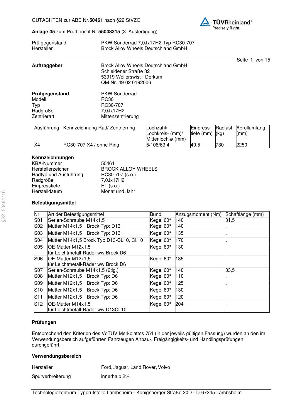 Dieses Gutachten (abe) bezieht sich auf die Alufelge Brock RC30-707 in der Ausführung 7Jx17 ET 0, Mittenloch 0 mm (KBA 50461). Im PDF findest du typischerweise zulässige Reifengrößen, Auflagen/Anbauhinweise und – je nach Dokument – Hinweise zur Eintragung.