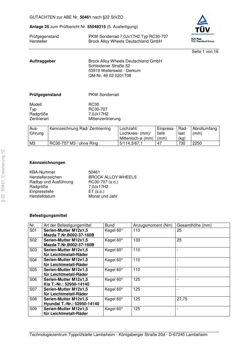 Dieses Gutachten (abe) bezieht sich auf die Alufelge Brock RC30-707 in der Ausführung 7Jx17 ET 0, Mittenloch 0 mm (KBA 50461). Im PDF findest du typischerweise zulässige Reifengrößen, Auflagen/Anbauhinweise und – je nach Dokument – Hinweise zur Eintragung.
