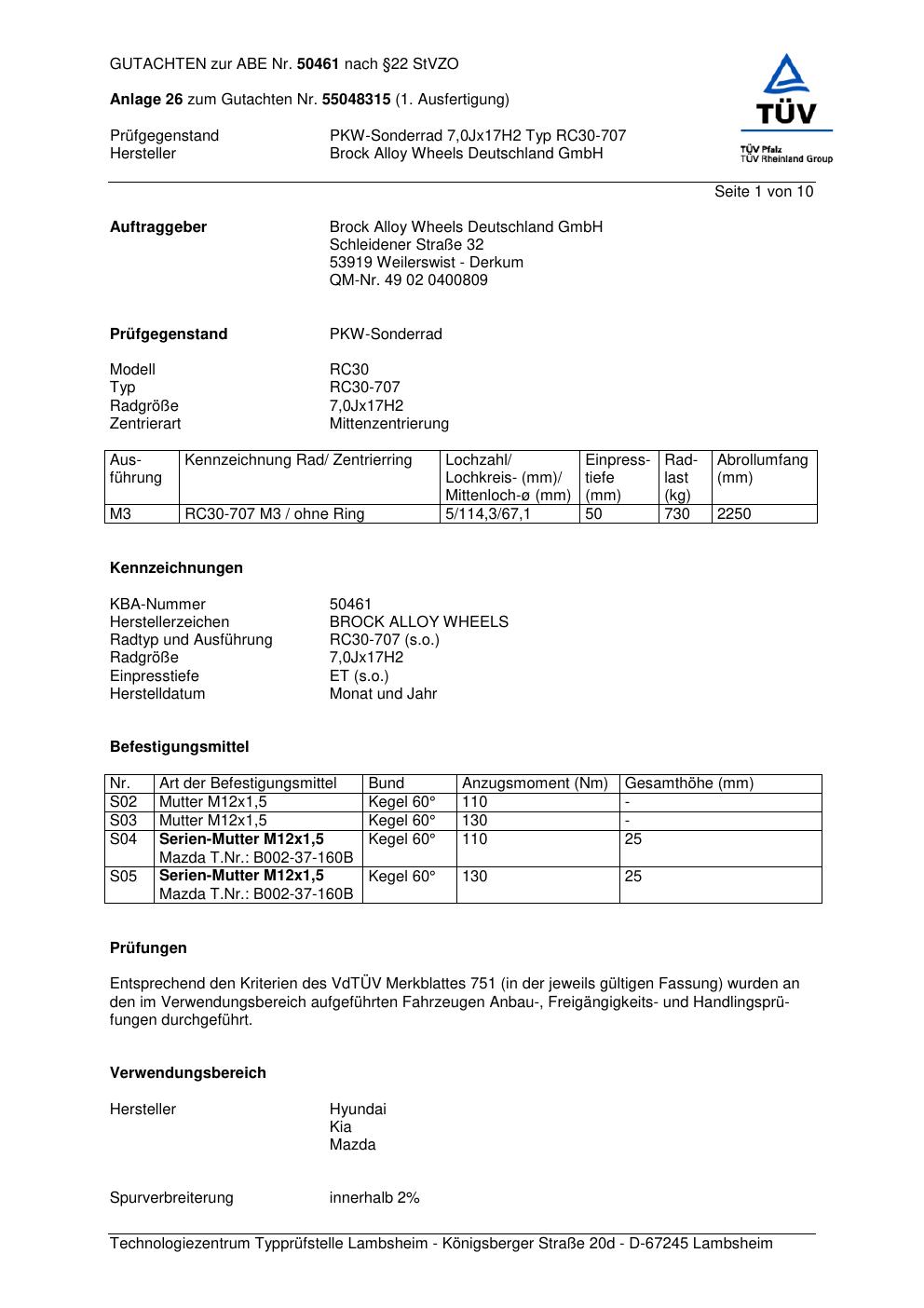 Dieses Gutachten (abe) bezieht sich auf die Alufelge Brock RC30-707 in der Ausführung 7Jx17 ET 0, Mittenloch 0 mm (KBA 50461). Im PDF findest du typischerweise zulässige Reifengrößen, Auflagen/Anbauhinweise und – je nach Dokument – Hinweise zur Eintragung.