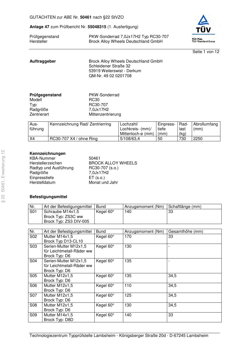 Dieses Gutachten (abe) bezieht sich auf die Alufelge Brock RC30-707 in der Ausführung 7Jx17 ET 0, Mittenloch 0 mm (KBA 50461). Im PDF findest du typischerweise zulässige Reifengrößen, Auflagen/Anbauhinweise und – je nach Dokument – Hinweise zur Eintragung.