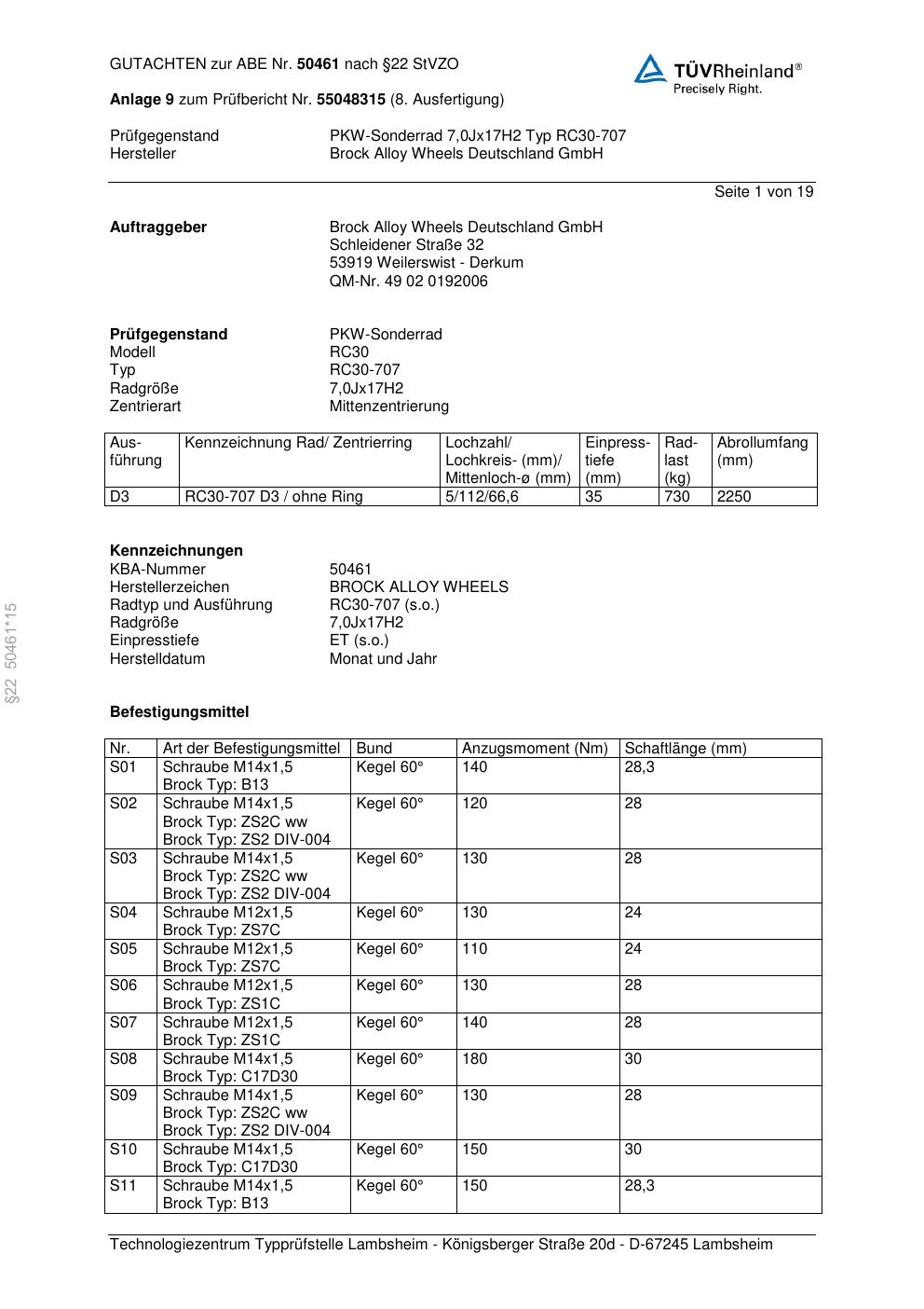 Dieses Gutachten (abe) bezieht sich auf die Alufelge Brock RC30-707 in der Ausführung 7Jx17 ET 0, Mittenloch 0 mm (KBA 50461). Im PDF findest du typischerweise zulässige Reifengrößen, Auflagen/Anbauhinweise und – je nach Dokument – Hinweise zur Eintragung.