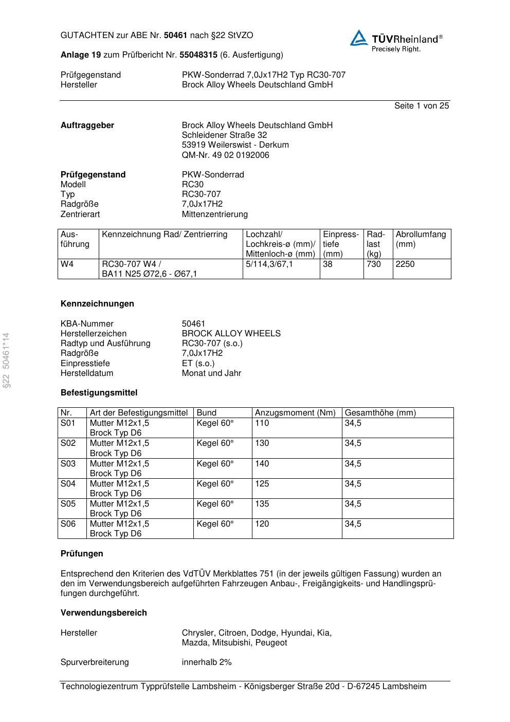 Dieses Gutachten (abe) bezieht sich auf die Alufelge Brock RC30-707 in der Ausführung 7Jx17 ET 0, Mittenloch 0 mm (KBA 50461). Im PDF findest du typischerweise zulässige Reifengrößen, Auflagen/Anbauhinweise und – je nach Dokument – Hinweise zur Eintragung.