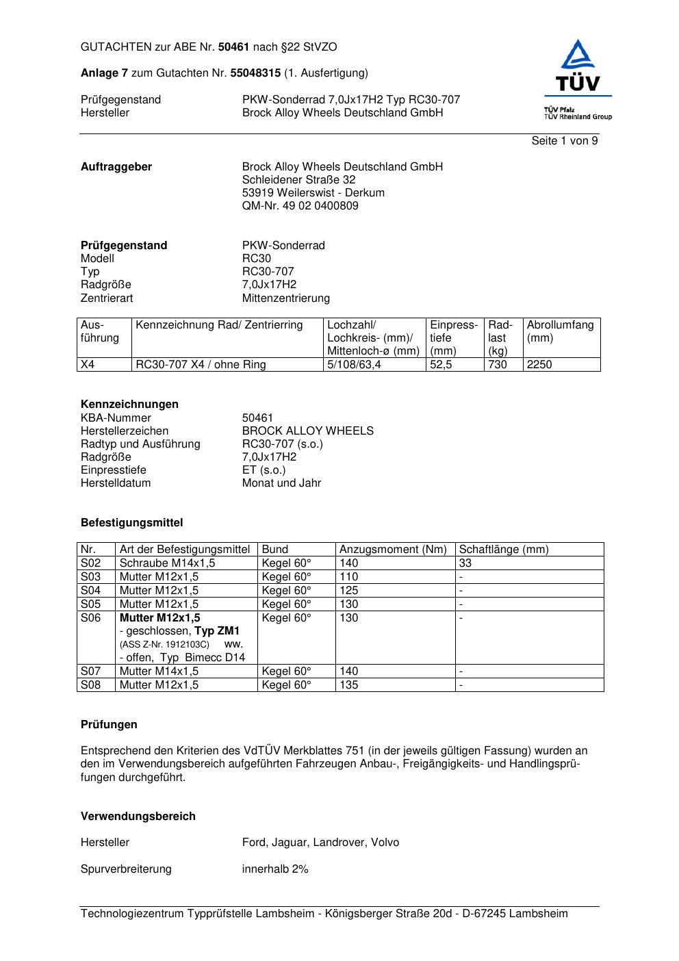 Dieses Gutachten (abe) bezieht sich auf die Alufelge Brock RC30-707 in der Ausführung 7Jx17 ET 0, Mittenloch 0 mm (KBA 50461). Im PDF findest du typischerweise zulässige Reifengrößen, Auflagen/Anbauhinweise und – je nach Dokument – Hinweise zur Eintragung.