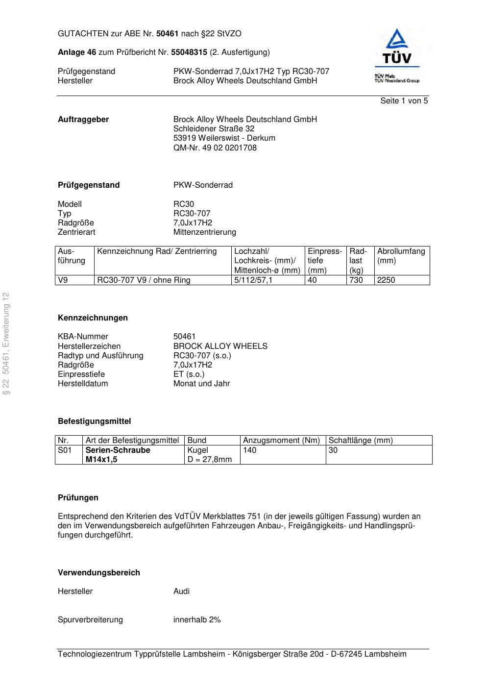 Dieses Gutachten (abe) bezieht sich auf die Alufelge Brock RC30-707 in der Ausführung 7Jx17 ET 0, Mittenloch 0 mm (KBA 50461). Im PDF findest du typischerweise zulässige Reifengrößen, Auflagen/Anbauhinweise und – je nach Dokument – Hinweise zur Eintragung.
