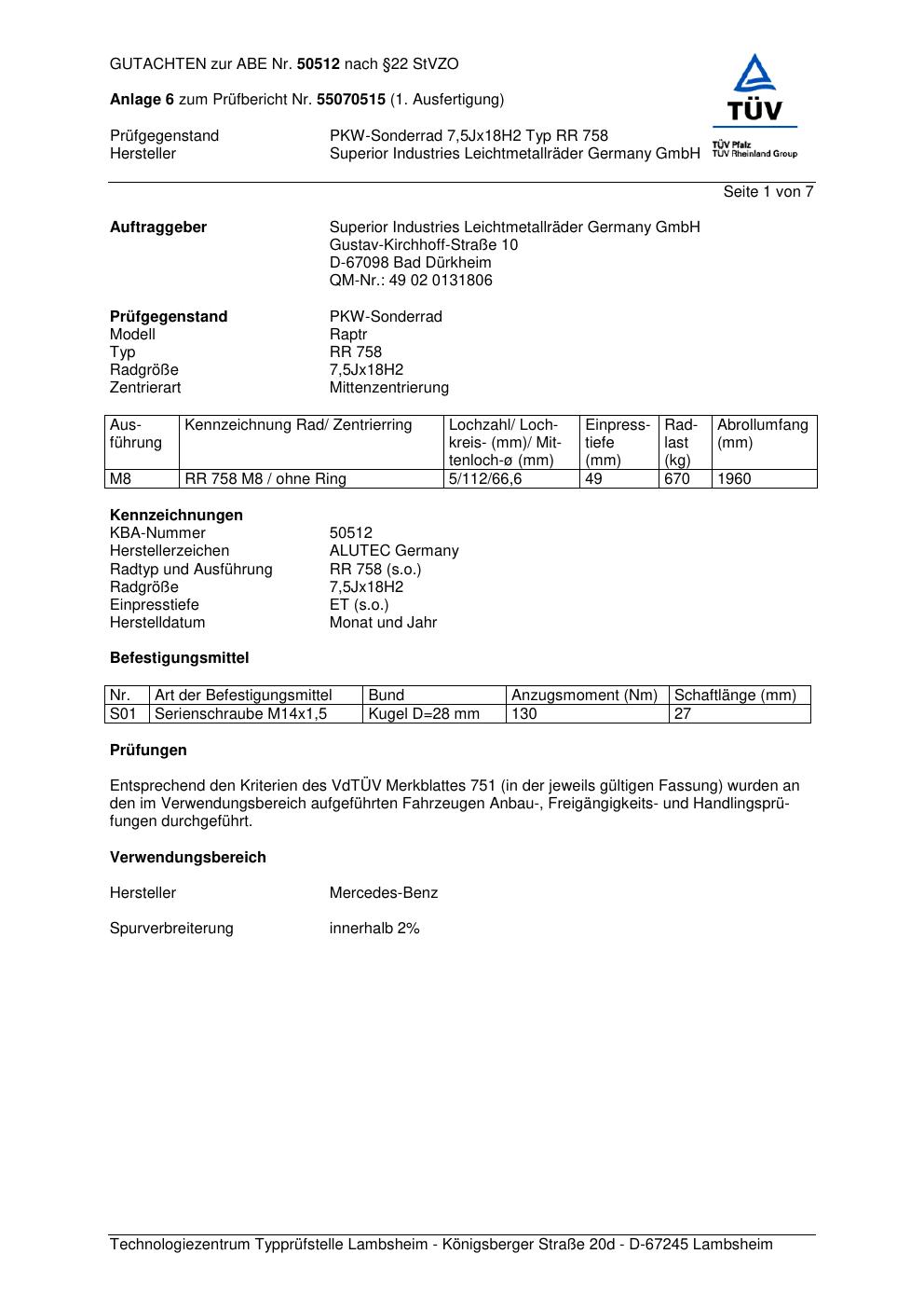 Dieses Gutachten (abe) bezieht sich auf die Alufelge ALUTEC RR 758 in der Ausführung 7.5Jx18 ET 0, Mittenloch 0 mm (KBA 50512). Im PDF findest du typischerweise zulässige Reifengrößen, Auflagen/Anbauhinweise und – je nach Dokument – Hinweise zur Eintragung.