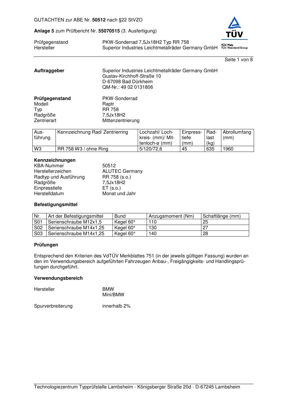 Dieses Gutachten (abe) bezieht sich auf die Alufelge ALUTEC RR 758 in der Ausführung 7.5Jx18 ET 0, Mittenloch 0 mm (KBA 50512). Im PDF findest du typischerweise zulässige Reifengrößen, Auflagen/Anbauhinweise und – je nach Dokument – Hinweise zur Eintragung.