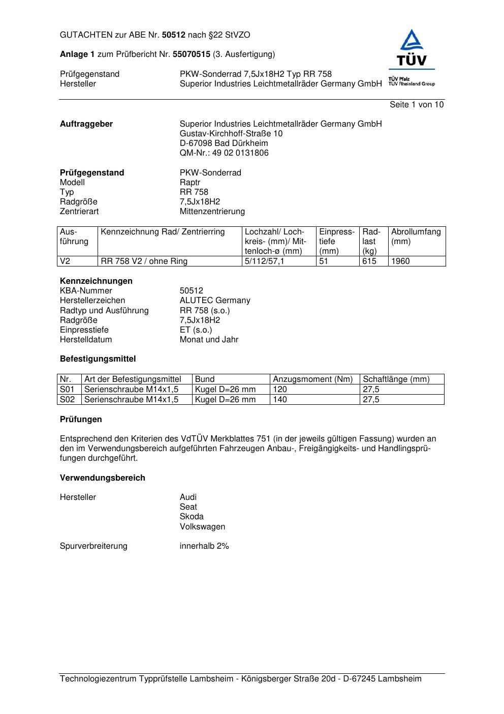 Dieses Gutachten (abe) bezieht sich auf die Alufelge ALUTEC RR 758 in der Ausführung 7.5Jx18 ET 0, Mittenloch 0 mm (KBA 50512). Im PDF findest du typischerweise zulässige Reifengrößen, Auflagen/Anbauhinweise und – je nach Dokument – Hinweise zur Eintragung.