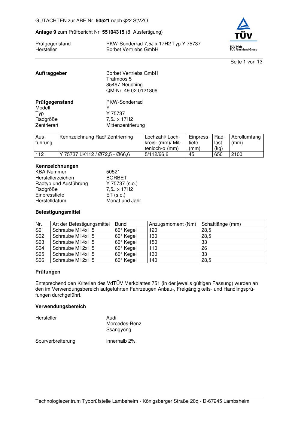Dieses Gutachten (abe) bezieht sich auf die Alufelge Borbet Y 7573 7 in der Ausführung 7.5Jx17 ET 0, Mittenloch 0 mm (KBA 50521). Im PDF findest du typischerweise zulässige Reifengrößen, Auflagen/Anbauhinweise und – je nach Dokument – Hinweise zur Eintragung.