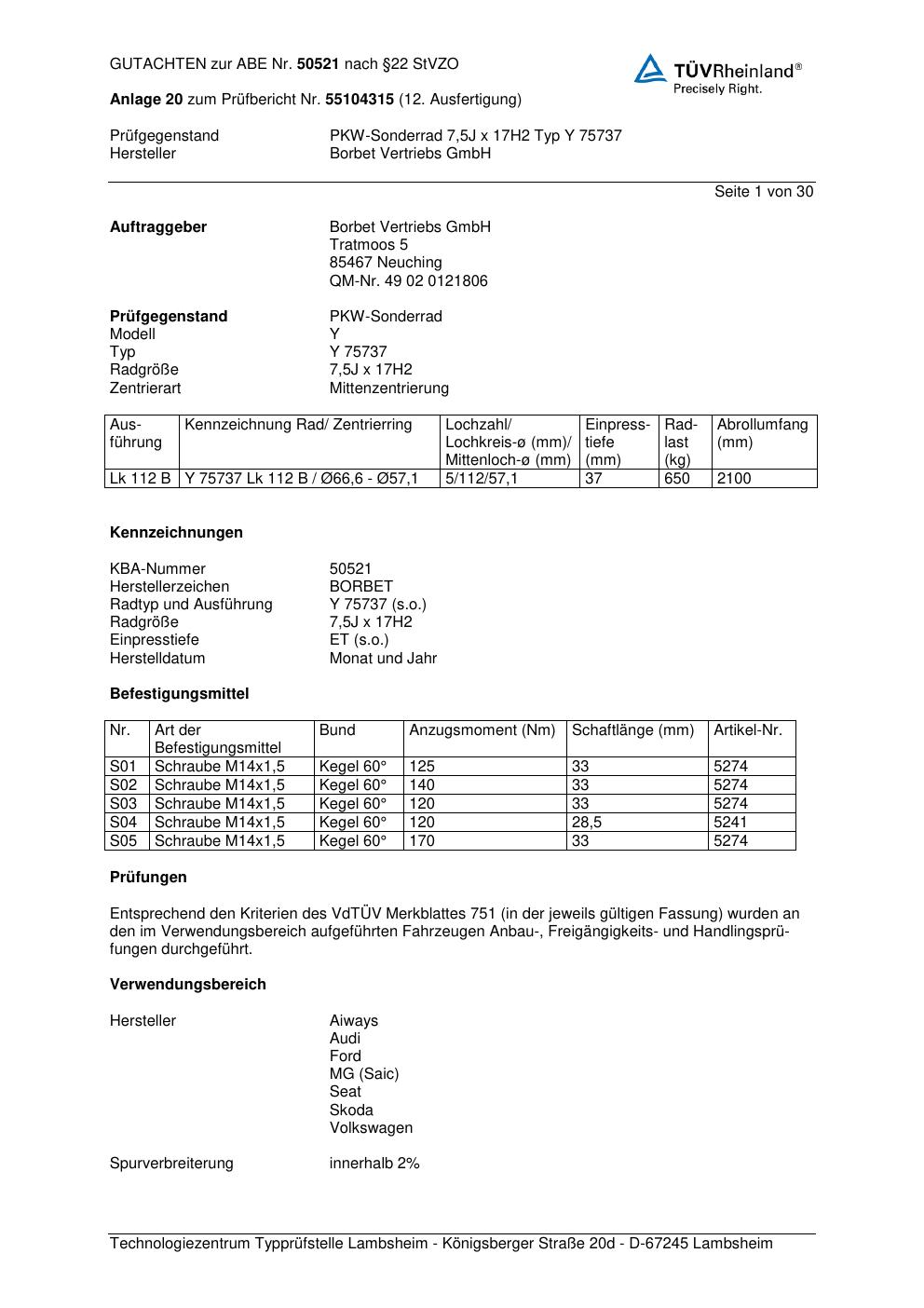 Dieses Gutachten (abe) bezieht sich auf die Alufelge Borbet Y 7573 7 in der Ausführung 7.5Jx17 ET 0, Mittenloch 0 mm (KBA 50521). Im PDF findest du typischerweise zulässige Reifengrößen, Auflagen/Anbauhinweise und – je nach Dokument – Hinweise zur Eintragung.