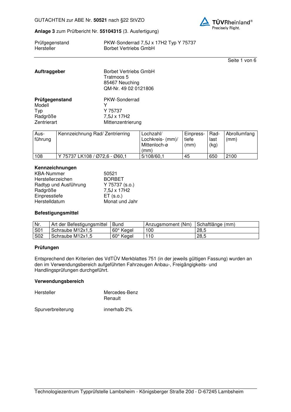 Dieses Gutachten (abe) bezieht sich auf die Alufelge Borbet Y 7573 7 in der Ausführung 7.5Jx17 ET 0, Mittenloch 0 mm (KBA 50521). Im PDF findest du typischerweise zulässige Reifengrößen, Auflagen/Anbauhinweise und – je nach Dokument – Hinweise zur Eintragung.