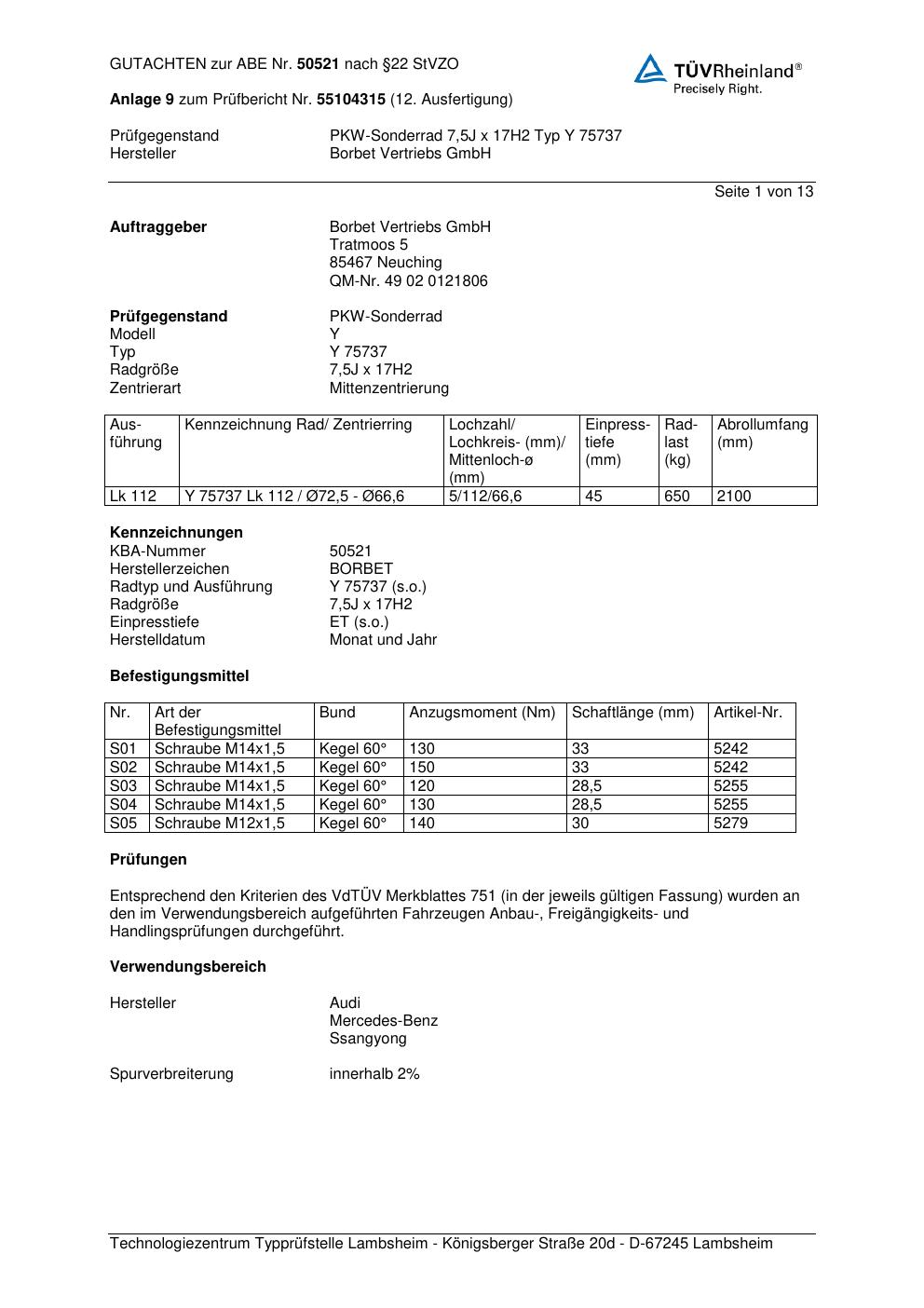 Dieses Gutachten (abe) bezieht sich auf die Alufelge Borbet Y 7573 7 in der Ausführung 7.5Jx17 ET 0, Mittenloch 0 mm (KBA 50521). Im PDF findest du typischerweise zulässige Reifengrößen, Auflagen/Anbauhinweise und – je nach Dokument – Hinweise zur Eintragung.