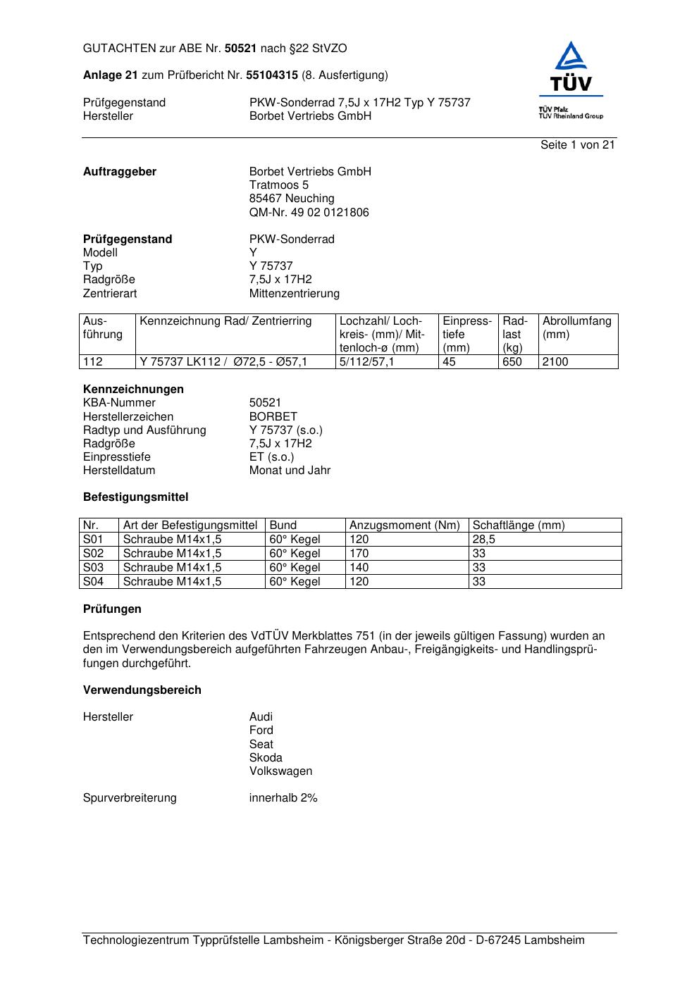 Dieses Gutachten (abe) bezieht sich auf die Alufelge Borbet Y 7573 7 in der Ausführung 7.5Jx17 ET 0, Mittenloch 0 mm (KBA 50521). Im PDF findest du typischerweise zulässige Reifengrößen, Auflagen/Anbauhinweise und – je nach Dokument – Hinweise zur Eintragung.