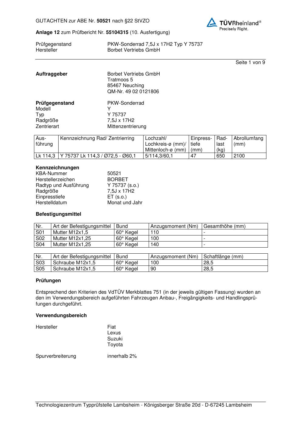 Dieses Gutachten (abe) bezieht sich auf die Alufelge Borbet Y 7573 7 in der Ausführung 7.5Jx17 ET 0, Mittenloch 0 mm (KBA 50521). Im PDF findest du typischerweise zulässige Reifengrößen, Auflagen/Anbauhinweise und – je nach Dokument – Hinweise zur Eintragung.