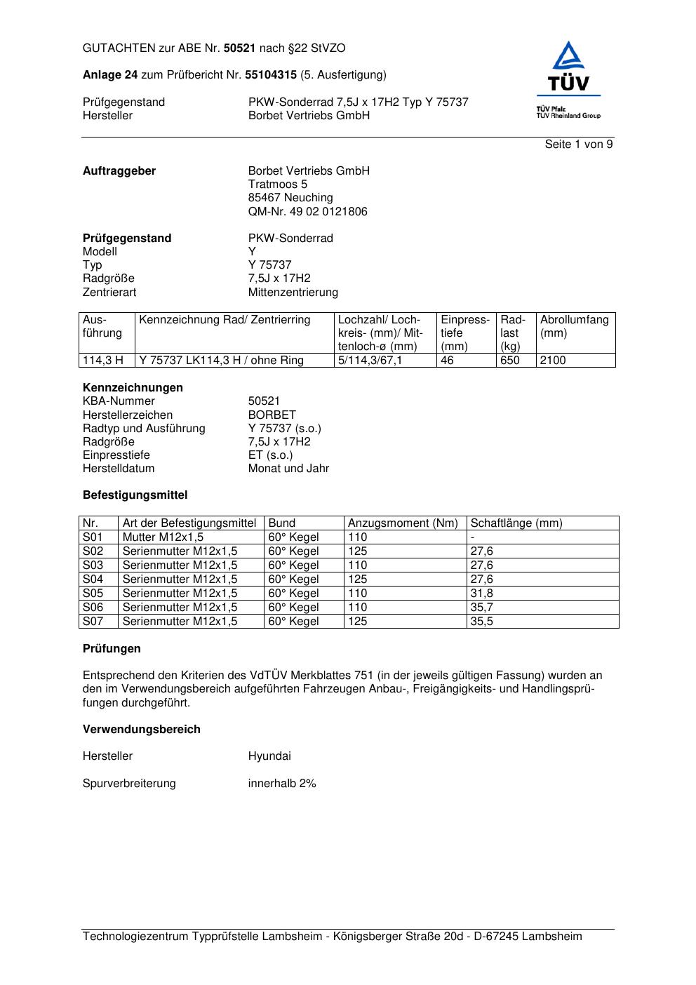 Dieses Gutachten (abe) bezieht sich auf die Alufelge Borbet Y 7573 7 in der Ausführung 7.5Jx17 ET 0, Mittenloch 0 mm (KBA 50521). Im PDF findest du typischerweise zulässige Reifengrößen, Auflagen/Anbauhinweise und – je nach Dokument – Hinweise zur Eintragung.