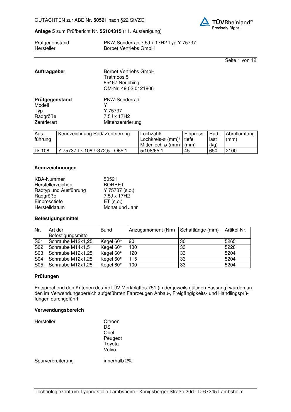 Dieses Gutachten (abe) bezieht sich auf die Alufelge Borbet Y 7573 7 in der Ausführung 7.5Jx17 ET 0, Mittenloch 0 mm (KBA 50521). Im PDF findest du typischerweise zulässige Reifengrößen, Auflagen/Anbauhinweise und – je nach Dokument – Hinweise zur Eintragung.