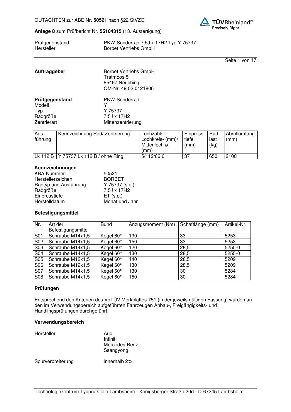 Dieses Gutachten (abe) bezieht sich auf die Alufelge Borbet Y 7573 7 in der Ausführung 7.5Jx17 ET 0, Mittenloch 0 mm (KBA 50521). Im PDF findest du typischerweise zulässige Reifengrößen, Auflagen/Anbauhinweise und – je nach Dokument – Hinweise zur Eintragung.