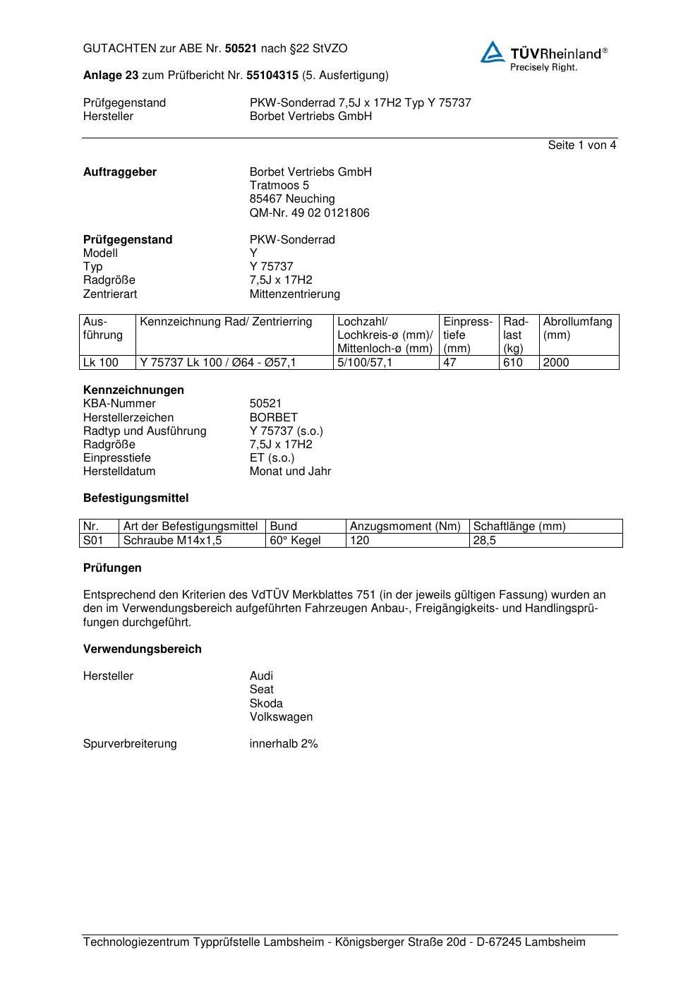 Dieses Gutachten (abe) bezieht sich auf die Alufelge Borbet Y 7573 7 in der Ausführung 7.5Jx17 ET 0, Mittenloch 0 mm (KBA 50521). Im PDF findest du typischerweise zulässige Reifengrößen, Auflagen/Anbauhinweise und – je nach Dokument – Hinweise zur Eintragung.