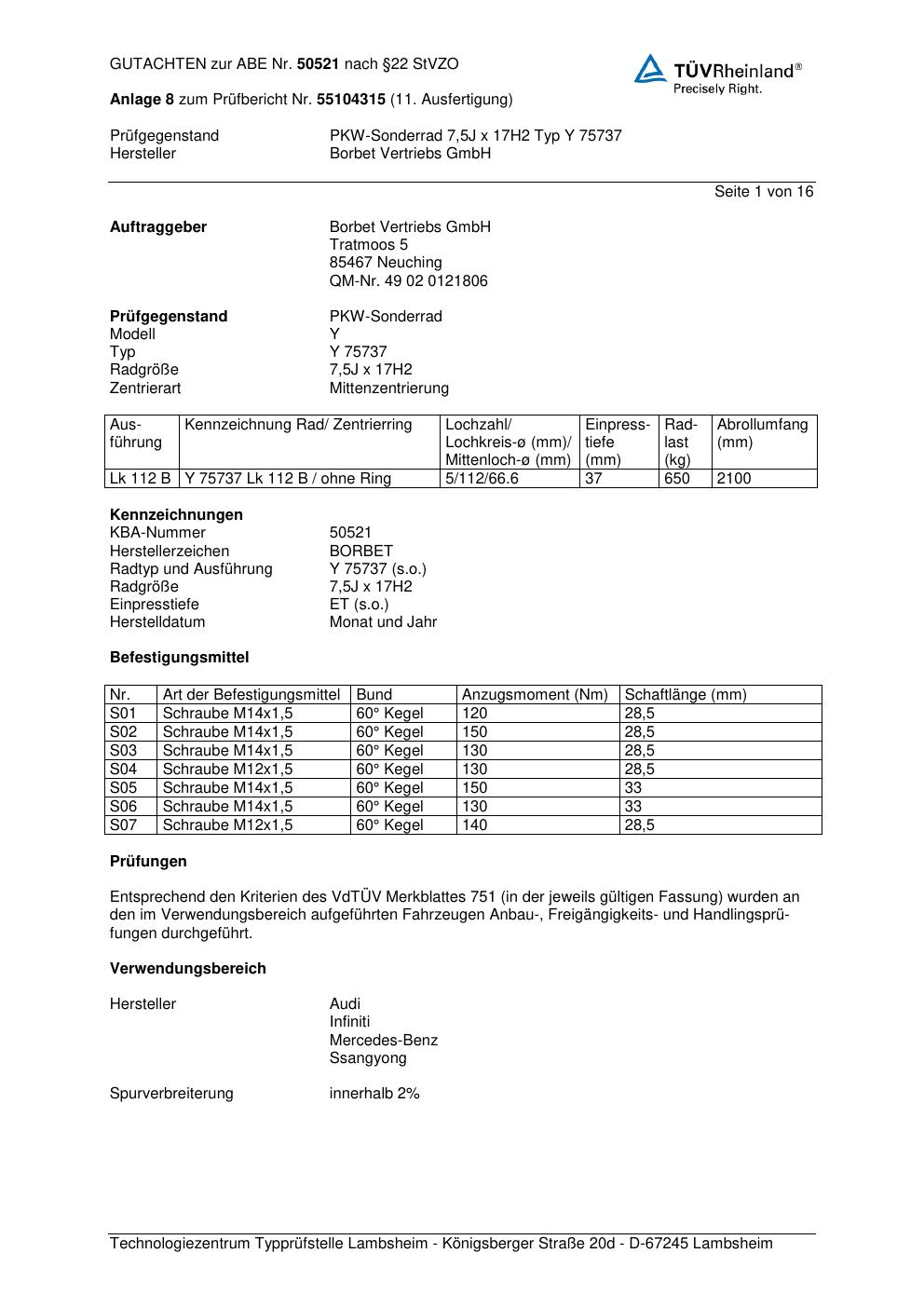 Dieses Gutachten (abe) bezieht sich auf die Alufelge Borbet Y 7573 7 in der Ausführung 7.5Jx17 ET 0, Mittenloch 0 mm (KBA 50521). Im PDF findest du typischerweise zulässige Reifengrößen, Auflagen/Anbauhinweise und – je nach Dokument – Hinweise zur Eintragung.