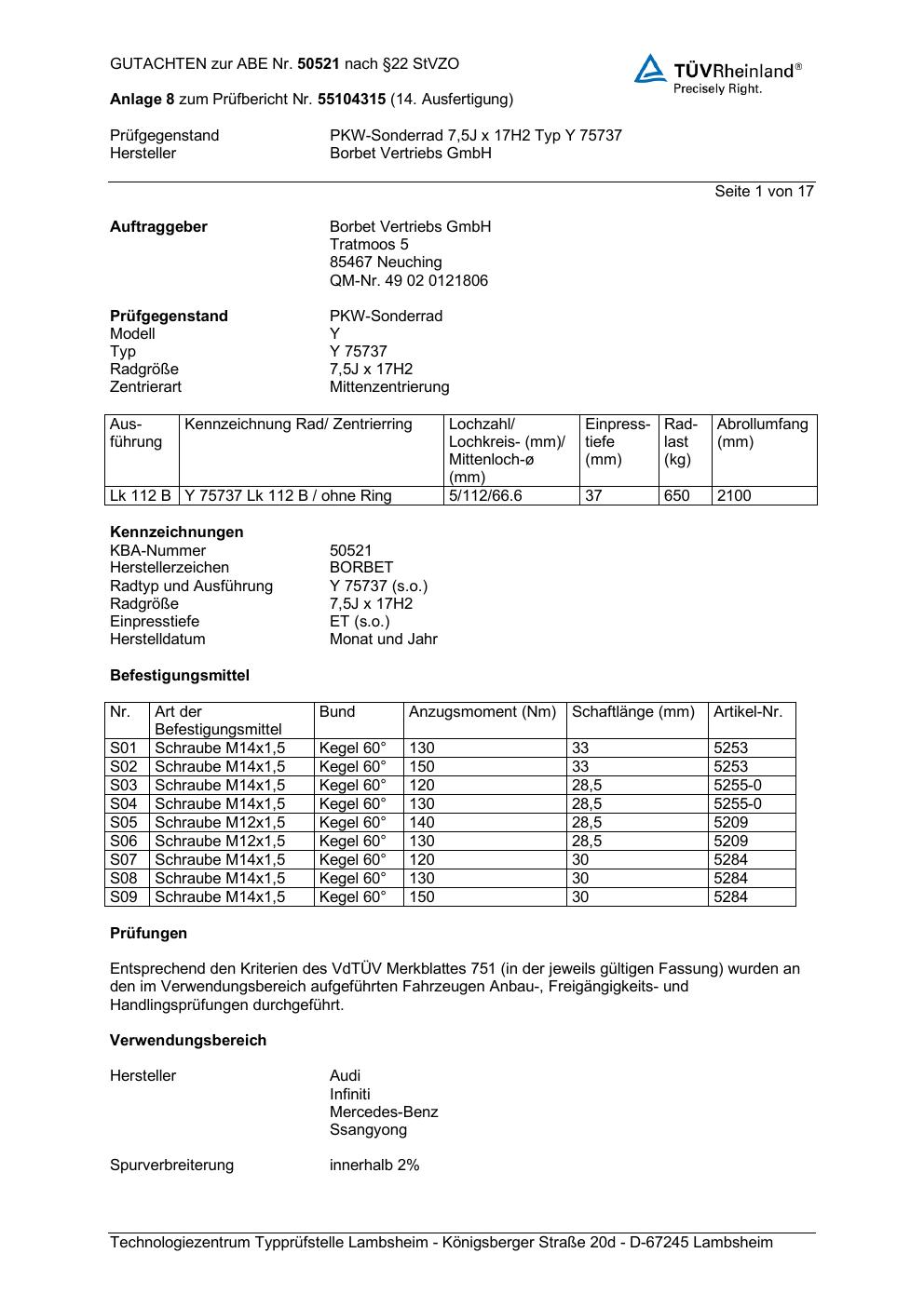 Dieses Gutachten (abe) bezieht sich auf die Alufelge Borbet Y 75737 in der Ausführung 7.5Jx17 ET 0, Mittenloch 0 mm (KBA 50521). Im PDF findest du typischerweise zulässige Reifengrößen, Auflagen/Anbauhinweise und – je nach Dokument – Hinweise zur Eintragung.