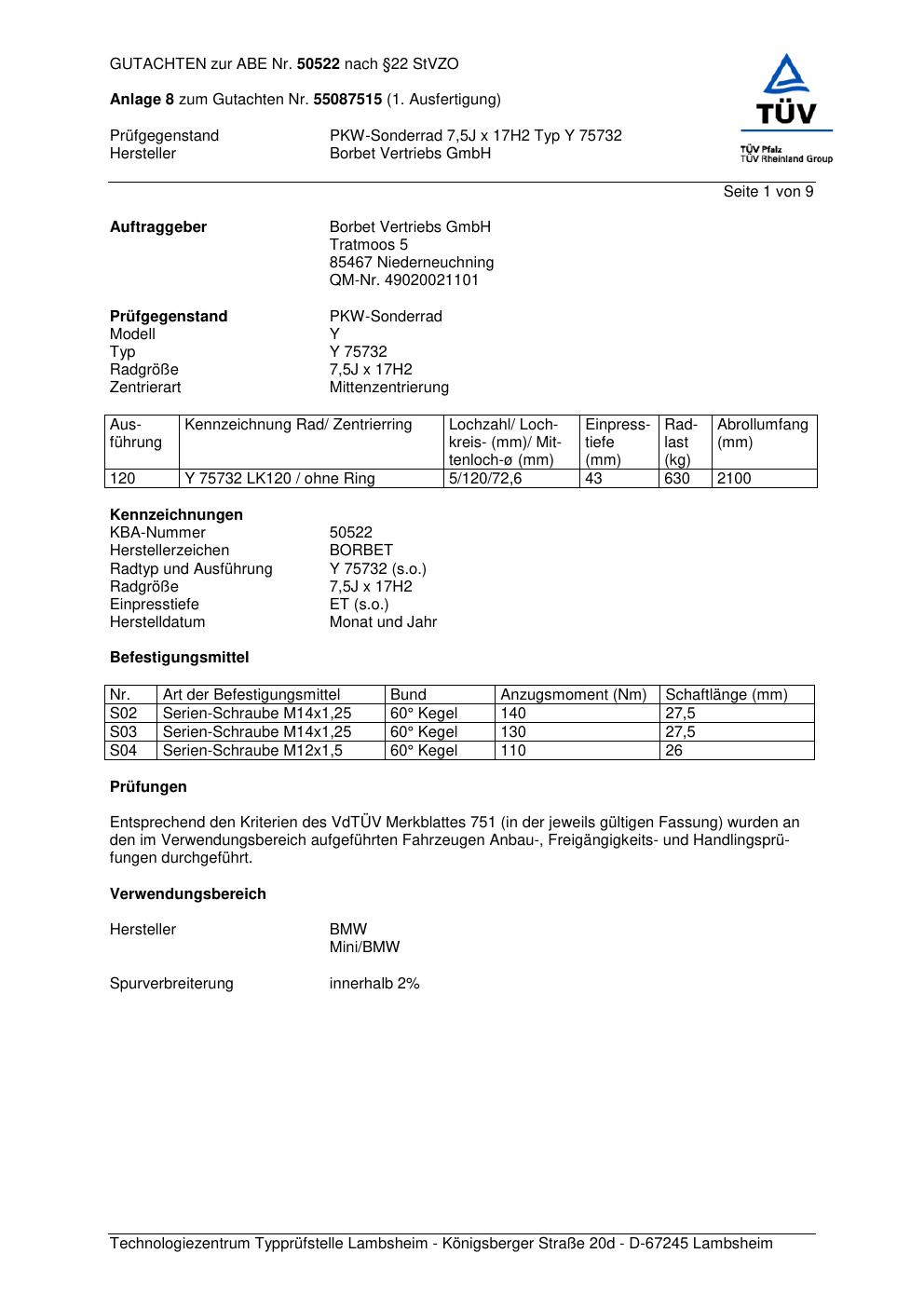 Dieses Gutachten (abe) bezieht sich auf die Alufelge Borbet Y 7573 2 in der Ausführung 7.5Jx17 ET 0, Mittenloch 0 mm (KBA 50522). Im PDF findest du typischerweise zulässige Reifengrößen, Auflagen/Anbauhinweise und – je nach Dokument – Hinweise zur Eintragung.