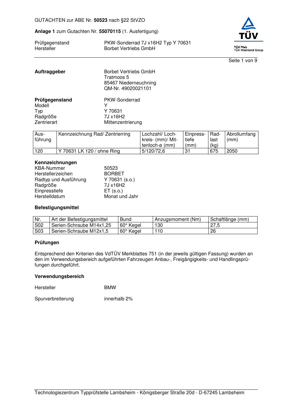 Dieses Gutachten (abe) bezieht sich auf die Alufelge Borbet Y 70631 in der Ausführung 7Jx16 ET 0, Mittenloch 0 mm (KBA 50523). Im PDF findest du typischerweise zulässige Reifengrößen, Auflagen/Anbauhinweise und – je nach Dokument – Hinweise zur Eintragung.