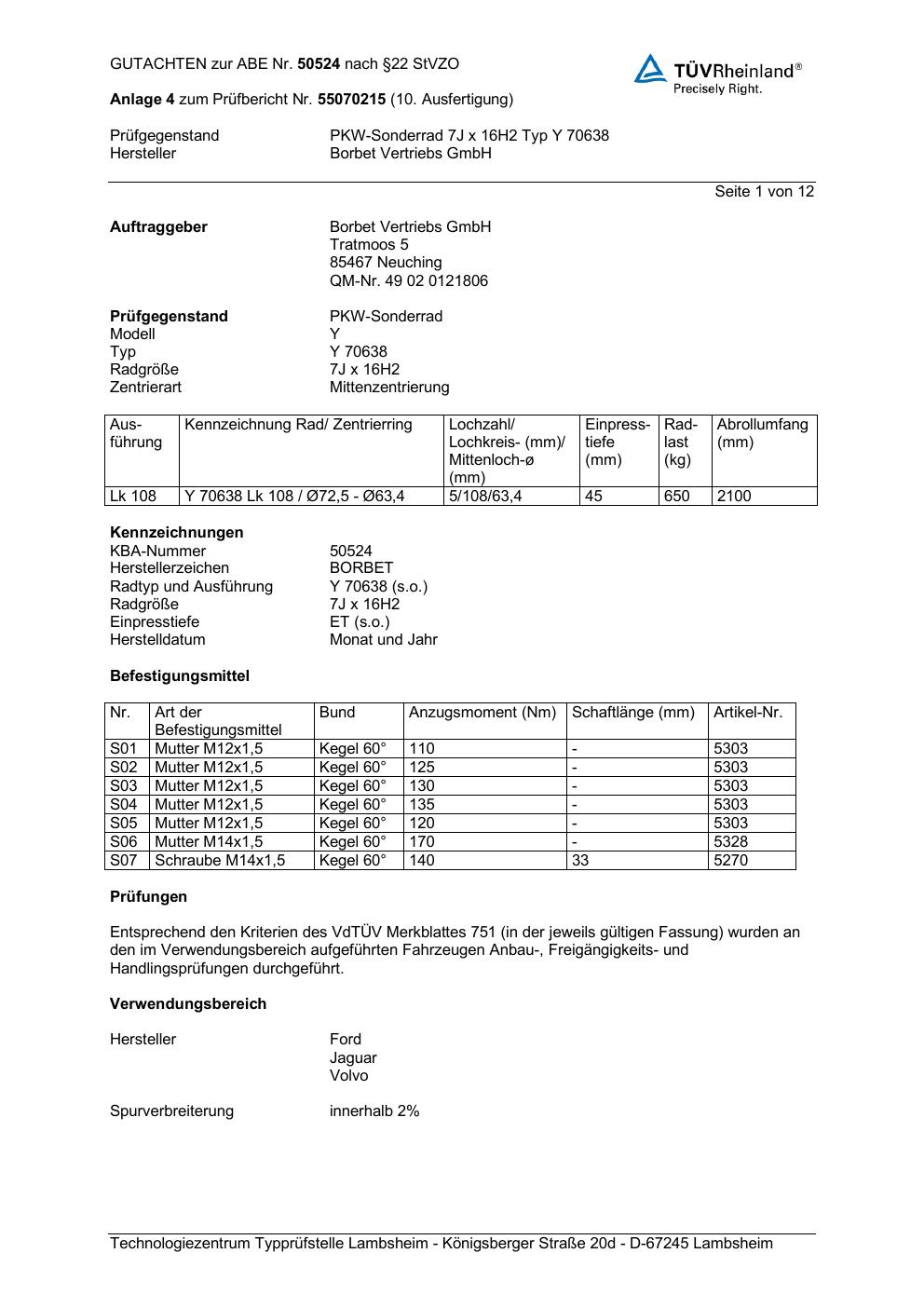 Dieses Gutachten (abe) bezieht sich auf die Alufelge Borbet Y 70638 in der Ausführung 7Jx16 ET 0, Mittenloch 0 mm (KBA 50524). Im PDF findest du typischerweise zulässige Reifengrößen, Auflagen/Anbauhinweise und – je nach Dokument – Hinweise zur Eintragung.