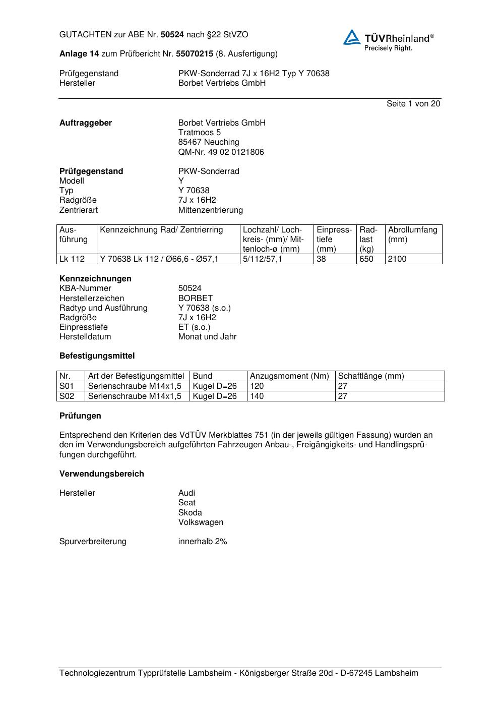 Dieses Gutachten (abe) bezieht sich auf die Alufelge Borbet Y 70638 in der Ausführung 7Jx16 ET 0, Mittenloch 0 mm (KBA 50524). Im PDF findest du typischerweise zulässige Reifengrößen, Auflagen/Anbauhinweise und – je nach Dokument – Hinweise zur Eintragung.
