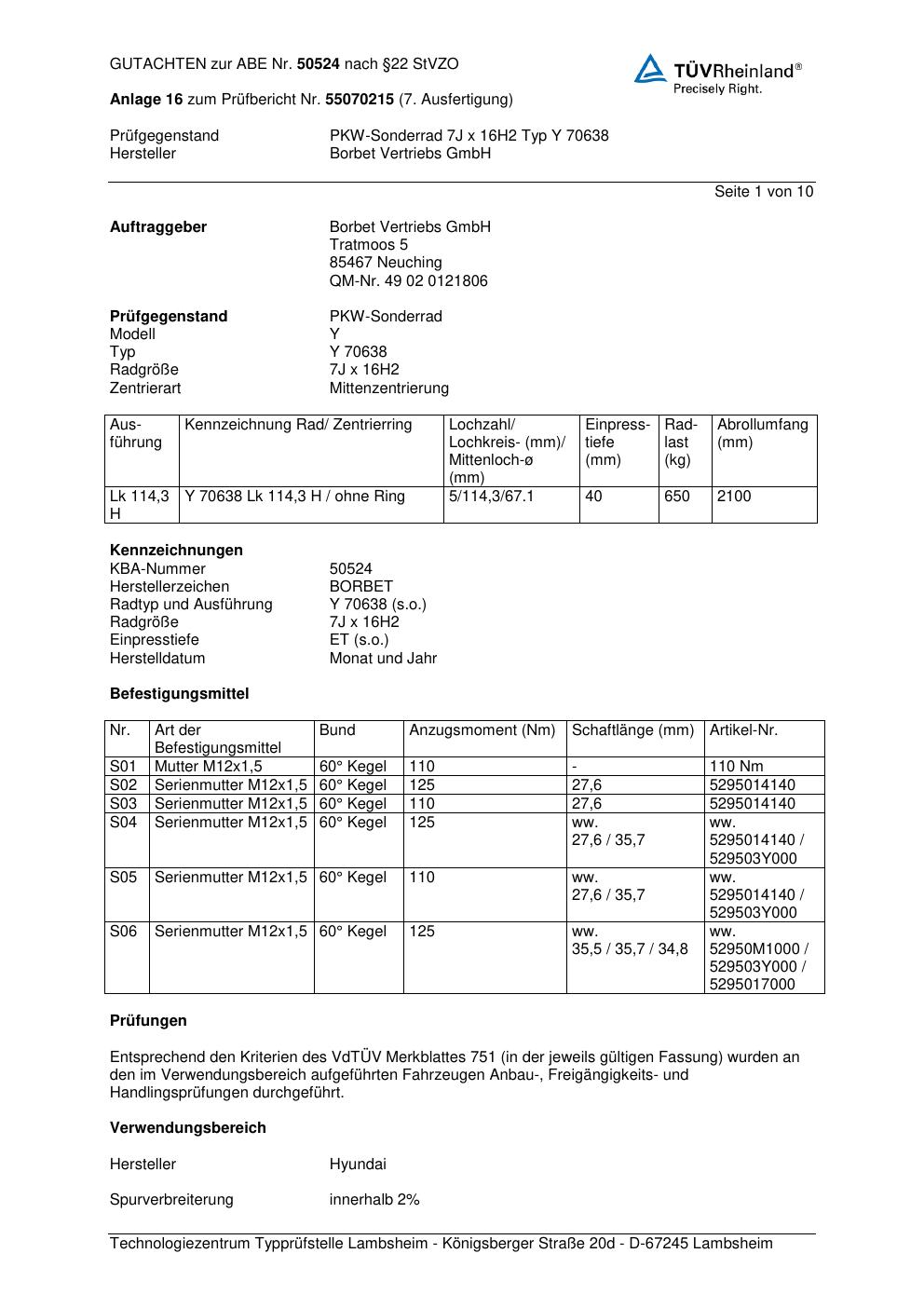 Dieses Gutachten (abe) bezieht sich auf die Alufelge Borbet Y 70638 in der Ausführung 7Jx16 ET 0, Mittenloch 0 mm (KBA 50524). Im PDF findest du typischerweise zulässige Reifengrößen, Auflagen/Anbauhinweise und – je nach Dokument – Hinweise zur Eintragung.