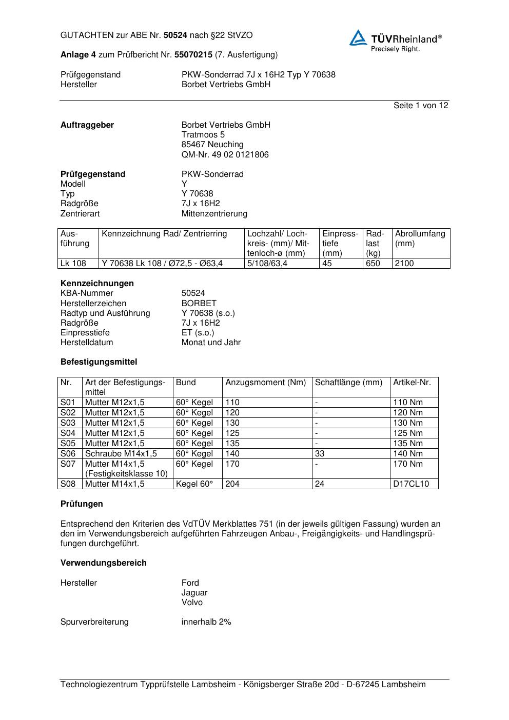Dieses Gutachten (abe) bezieht sich auf die Alufelge Borbet Y 70638 in der Ausführung 7Jx16 ET 0, Mittenloch 0 mm (KBA 50524). Im PDF findest du typischerweise zulässige Reifengrößen, Auflagen/Anbauhinweise und – je nach Dokument – Hinweise zur Eintragung.