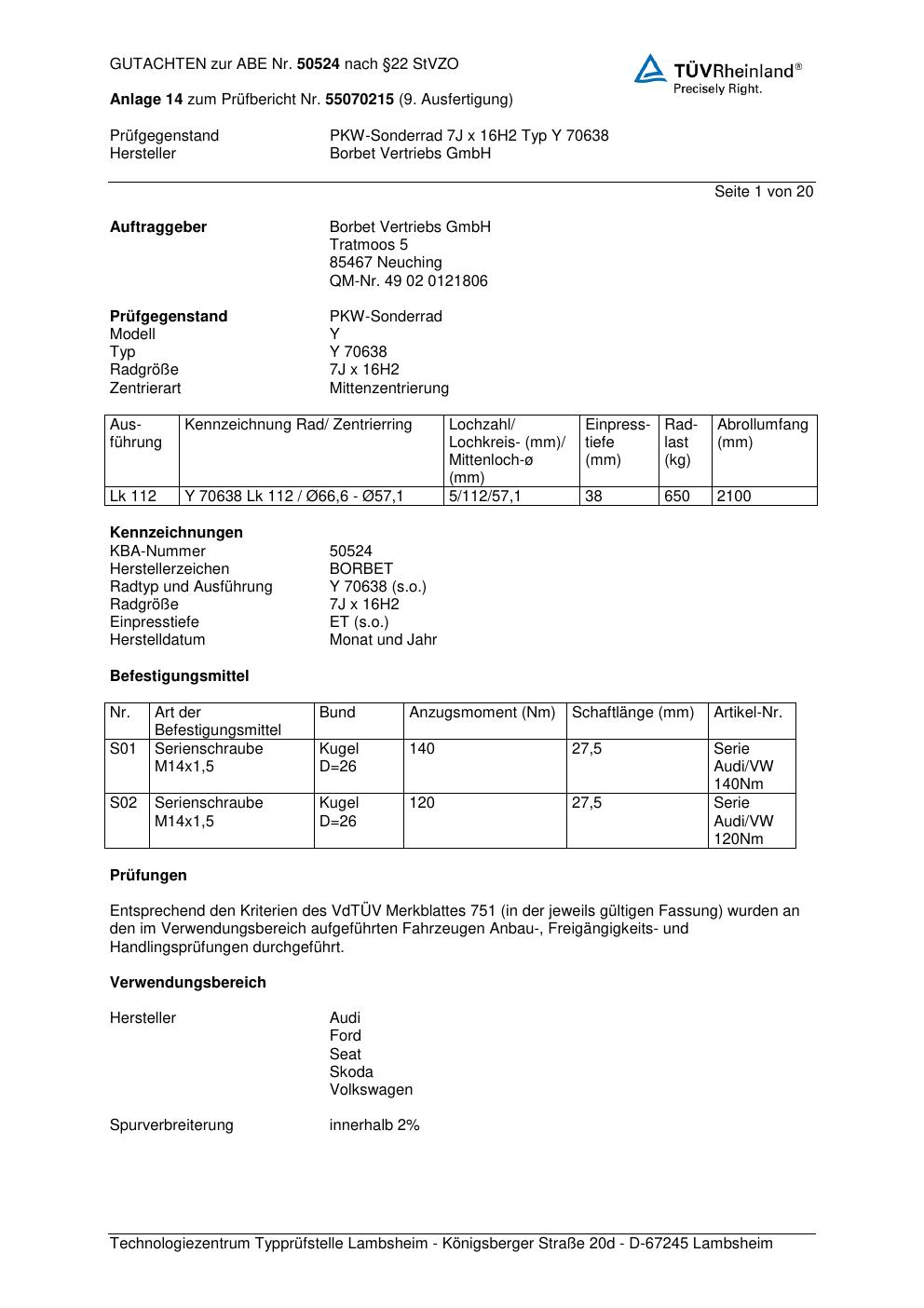 Dieses Gutachten (abe) bezieht sich auf die Alufelge Borbet Y 70638 in der Ausführung 7Jx16 ET 0, Mittenloch 0 mm (KBA 50524). Im PDF findest du typischerweise zulässige Reifengrößen, Auflagen/Anbauhinweise und – je nach Dokument – Hinweise zur Eintragung.