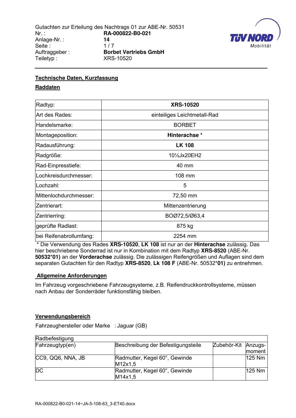 Dieses Gutachten (abe) bezieht sich auf die Alufelge brand-borbet XRS-10520 in der Ausführung 8.5Jx2 ET 0, Mittenloch 0 mm (KBA 50532). Im PDF findest du typischerweise zulässige Reifengrößen, Auflagen/Anbauhinweise und – je nach Dokument – Hinweise zur Eintragung.