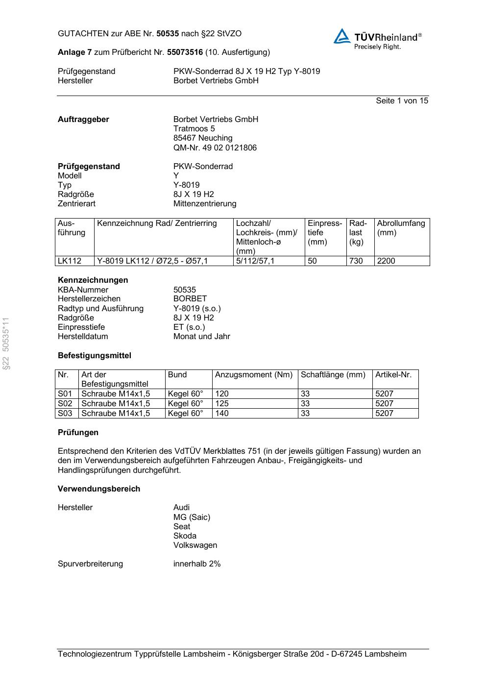 Dieses Gutachten (abe) bezieht sich auf die Alufelge Borbet Y-8019 in der Ausführung 8Jx19 ET 0, Mittenloch 0 mm (KBA 50535). Im PDF findest du typischerweise zulässige Reifengrößen, Auflagen/Anbauhinweise und – je nach Dokument – Hinweise zur Eintragung.
