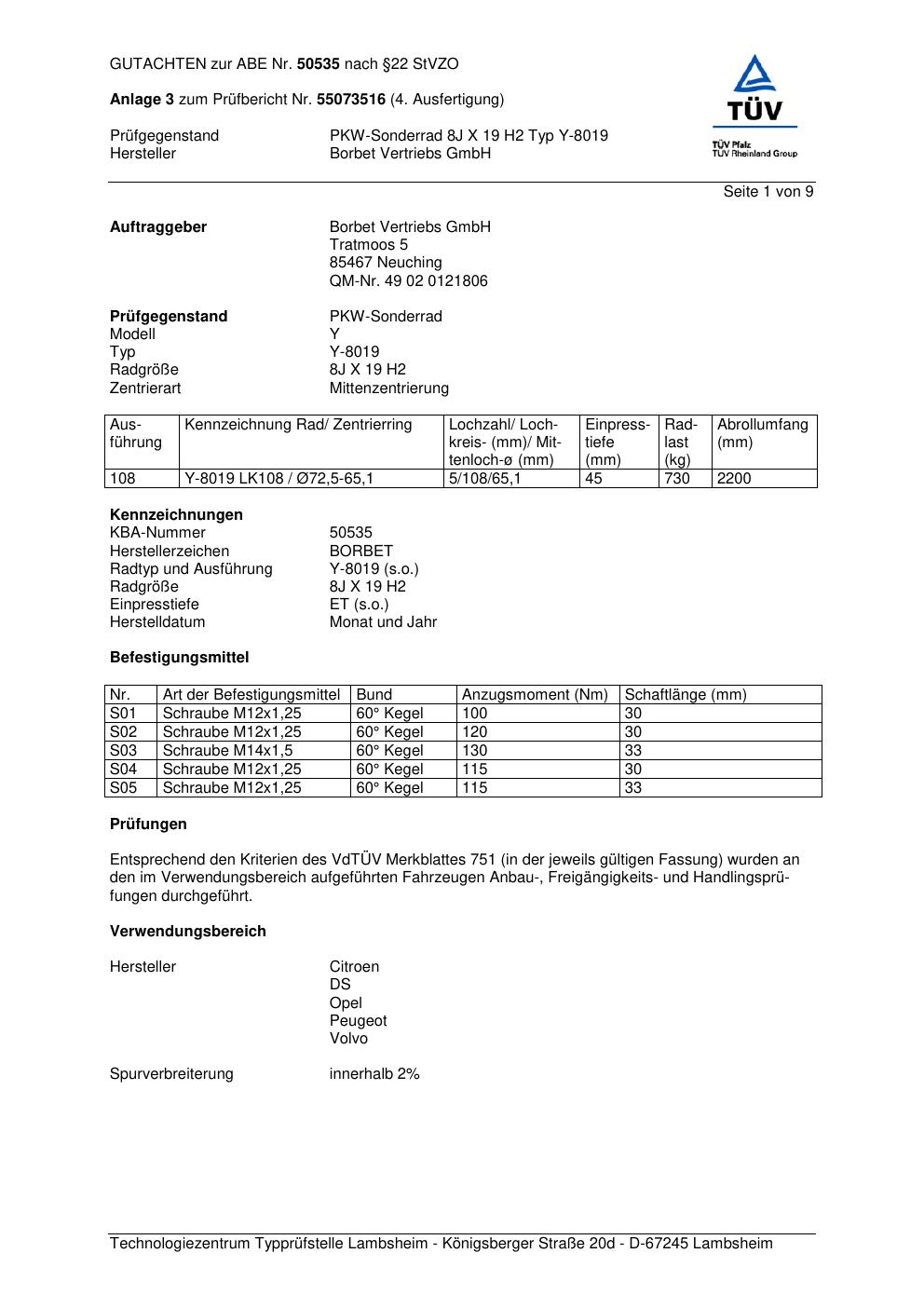 Dieses Gutachten (abe) bezieht sich auf die Alufelge Borbet Y-8019 in der Ausführung 8Jx19 ET 0, Mittenloch 0 mm (KBA 50535). Im PDF findest du typischerweise zulässige Reifengrößen, Auflagen/Anbauhinweise und – je nach Dokument – Hinweise zur Eintragung.