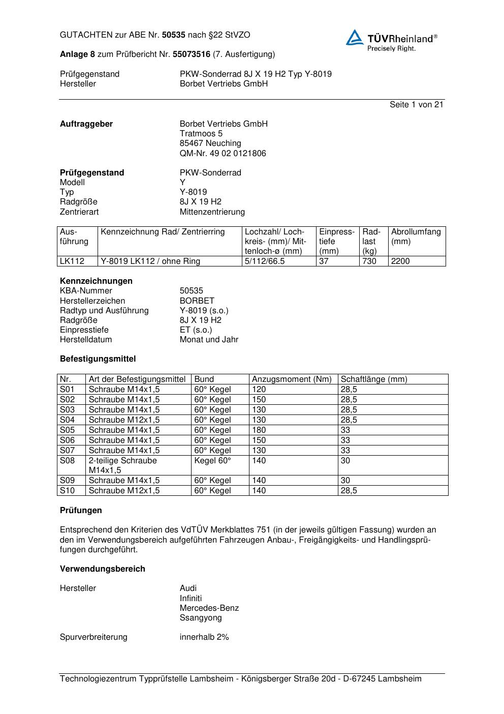 Dieses Gutachten (abe) bezieht sich auf die Alufelge Borbet Y-8019 in der Ausführung 8Jx19 ET 0, Mittenloch 0 mm (KBA 50535). Im PDF findest du typischerweise zulässige Reifengrößen, Auflagen/Anbauhinweise und – je nach Dokument – Hinweise zur Eintragung.