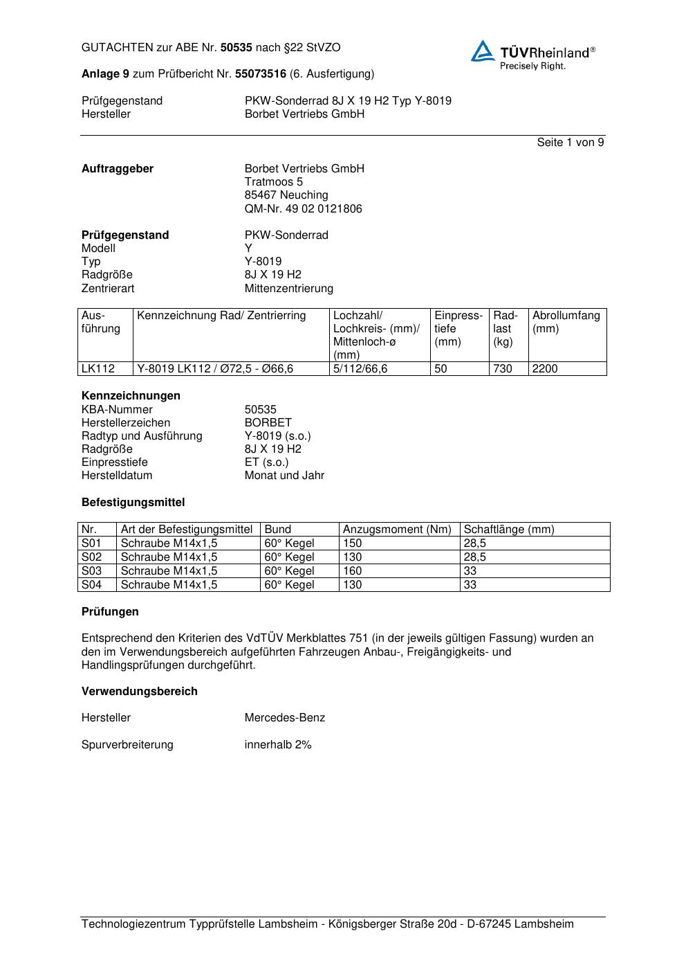 Dieses Gutachten (abe) bezieht sich auf die Alufelge Borbet Y-8019 in der Ausführung 8Jx19 ET 0, Mittenloch 0 mm (KBA 50535). Im PDF findest du typischerweise zulässige Reifengrößen, Auflagen/Anbauhinweise und – je nach Dokument – Hinweise zur Eintragung.