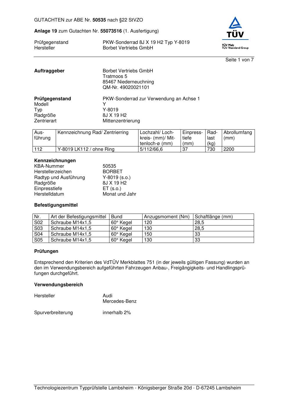 Dieses Gutachten (abe) bezieht sich auf die Alufelge Borbet Y-8019 in der Ausführung 8Jx19 ET 0, Mittenloch 0 mm (KBA 50535). Im PDF findest du typischerweise zulässige Reifengrößen, Auflagen/Anbauhinweise und – je nach Dokument – Hinweise zur Eintragung.
