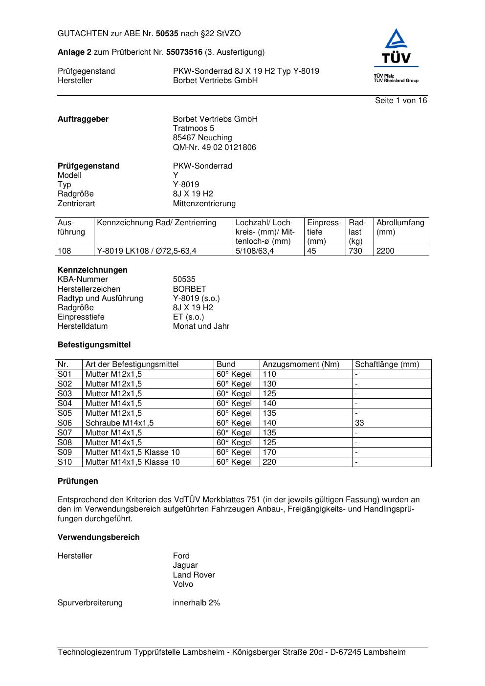 Dieses Gutachten (abe) bezieht sich auf die Alufelge Borbet Y-8019 in der Ausführung 8Jx19 ET 0, Mittenloch 0 mm (KBA 50535). Im PDF findest du typischerweise zulässige Reifengrößen, Auflagen/Anbauhinweise und – je nach Dokument – Hinweise zur Eintragung.