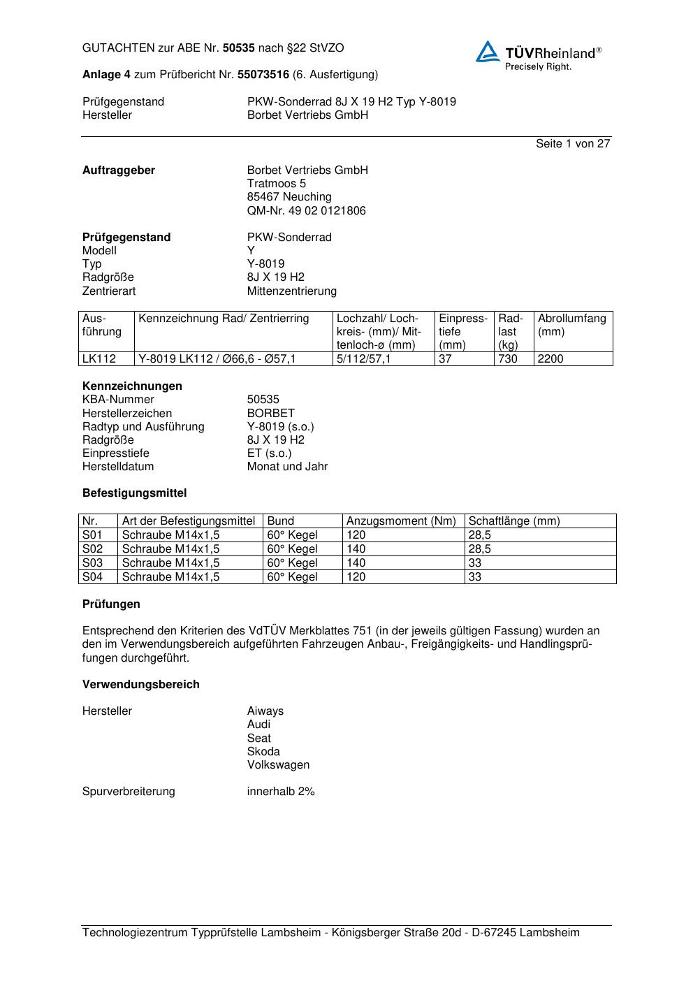 Dieses Gutachten (abe) bezieht sich auf die Alufelge Borbet Y-8019 in der Ausführung 8Jx19 ET 0, Mittenloch 0 mm (KBA 50535). Im PDF findest du typischerweise zulässige Reifengrößen, Auflagen/Anbauhinweise und – je nach Dokument – Hinweise zur Eintragung.