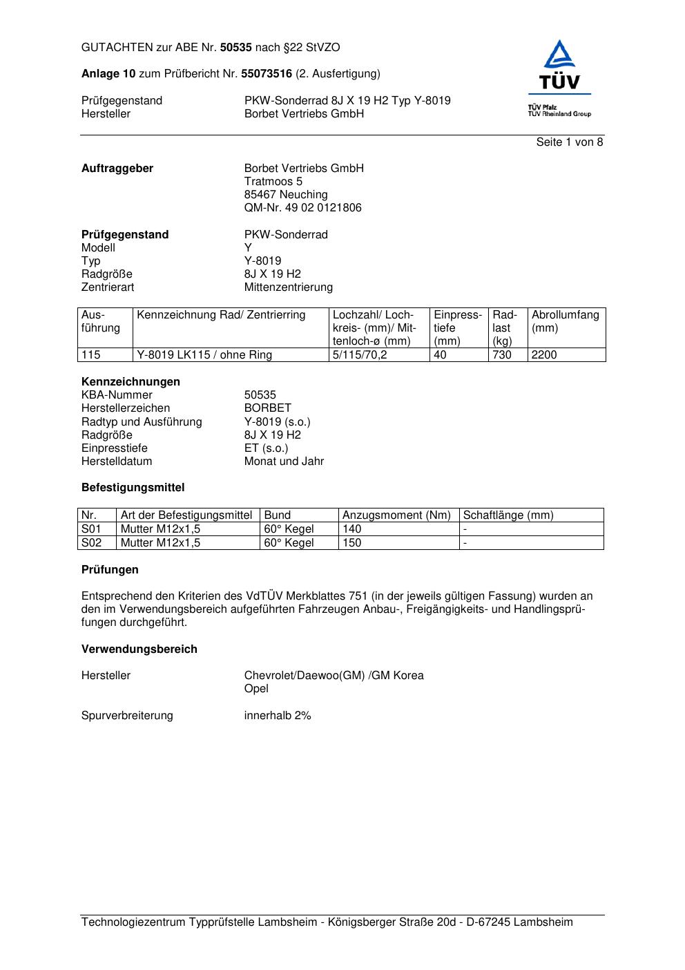 Dieses Gutachten (abe) bezieht sich auf die Alufelge Borbet Y-8019 in der Ausführung 8Jx19 ET 0, Mittenloch 0 mm (KBA 50535). Im PDF findest du typischerweise zulässige Reifengrößen, Auflagen/Anbauhinweise und – je nach Dokument – Hinweise zur Eintragung.