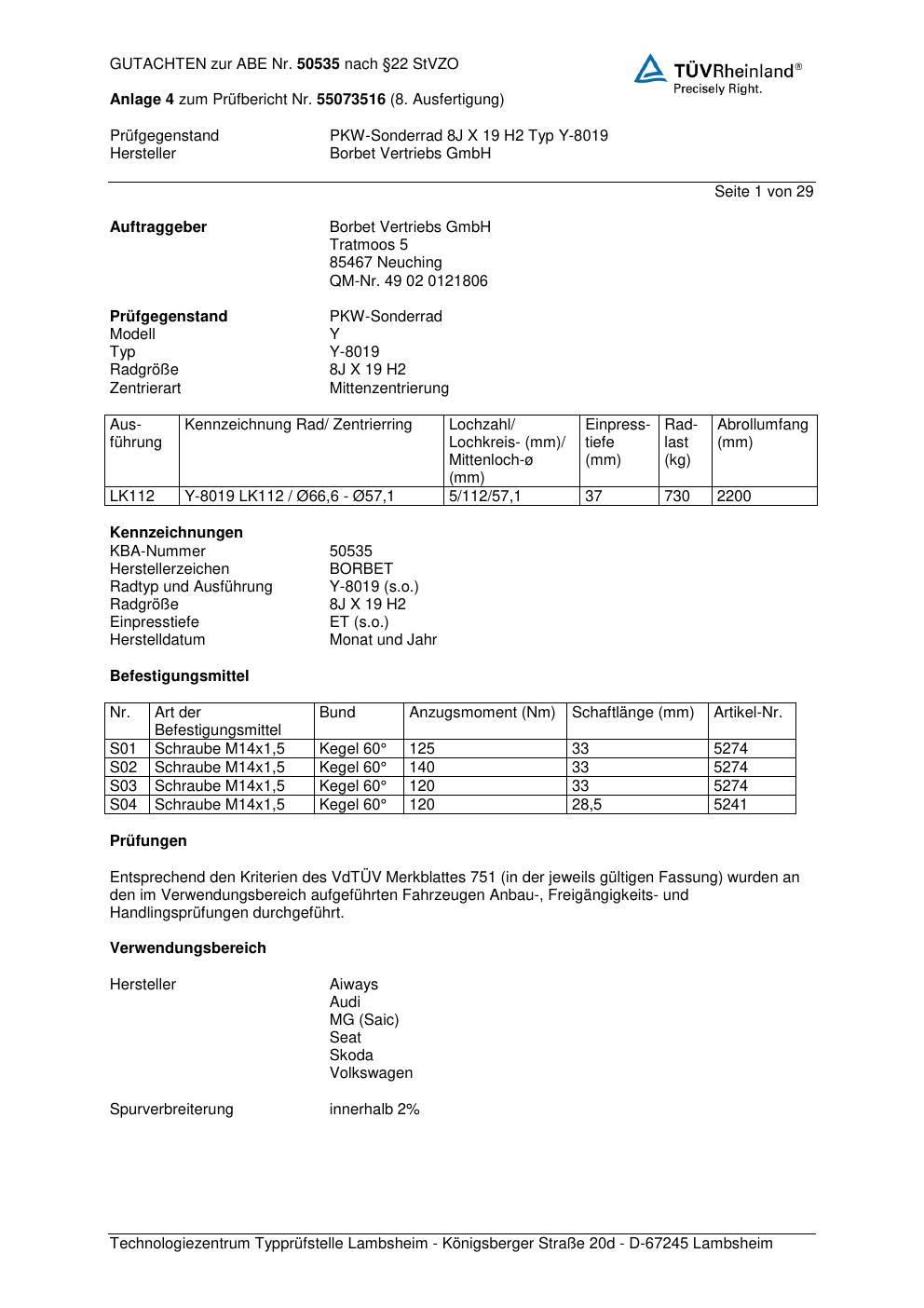 Dieses Gutachten (abe) bezieht sich auf die Alufelge Borbet Y-8019 in der Ausführung 8Jx19 ET 0, Mittenloch 0 mm (KBA 50535). Im PDF findest du typischerweise zulässige Reifengrößen, Auflagen/Anbauhinweise und – je nach Dokument – Hinweise zur Eintragung.