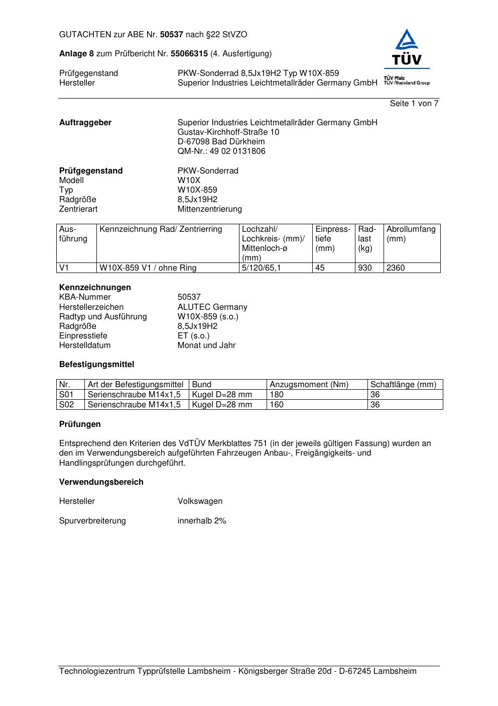 Dieses Gutachten (abe) bezieht sich auf die Alufelge ALUTEC W10X-859 in der Ausführung 8.5Jx19 ET 0, Mittenloch 0 mm (KBA 50537). Im PDF findest du typischerweise zulässige Reifengrößen, Auflagen/Anbauhinweise und – je nach Dokument – Hinweise zur Eintragung.
